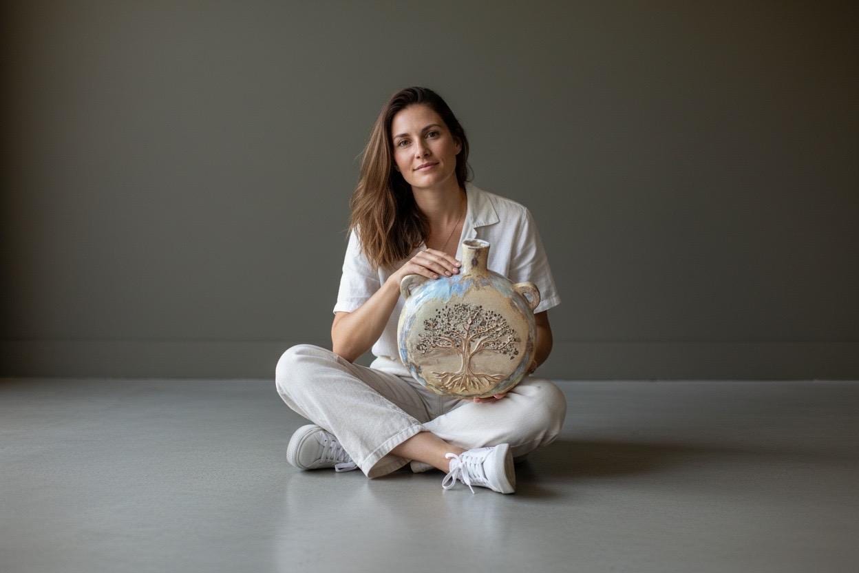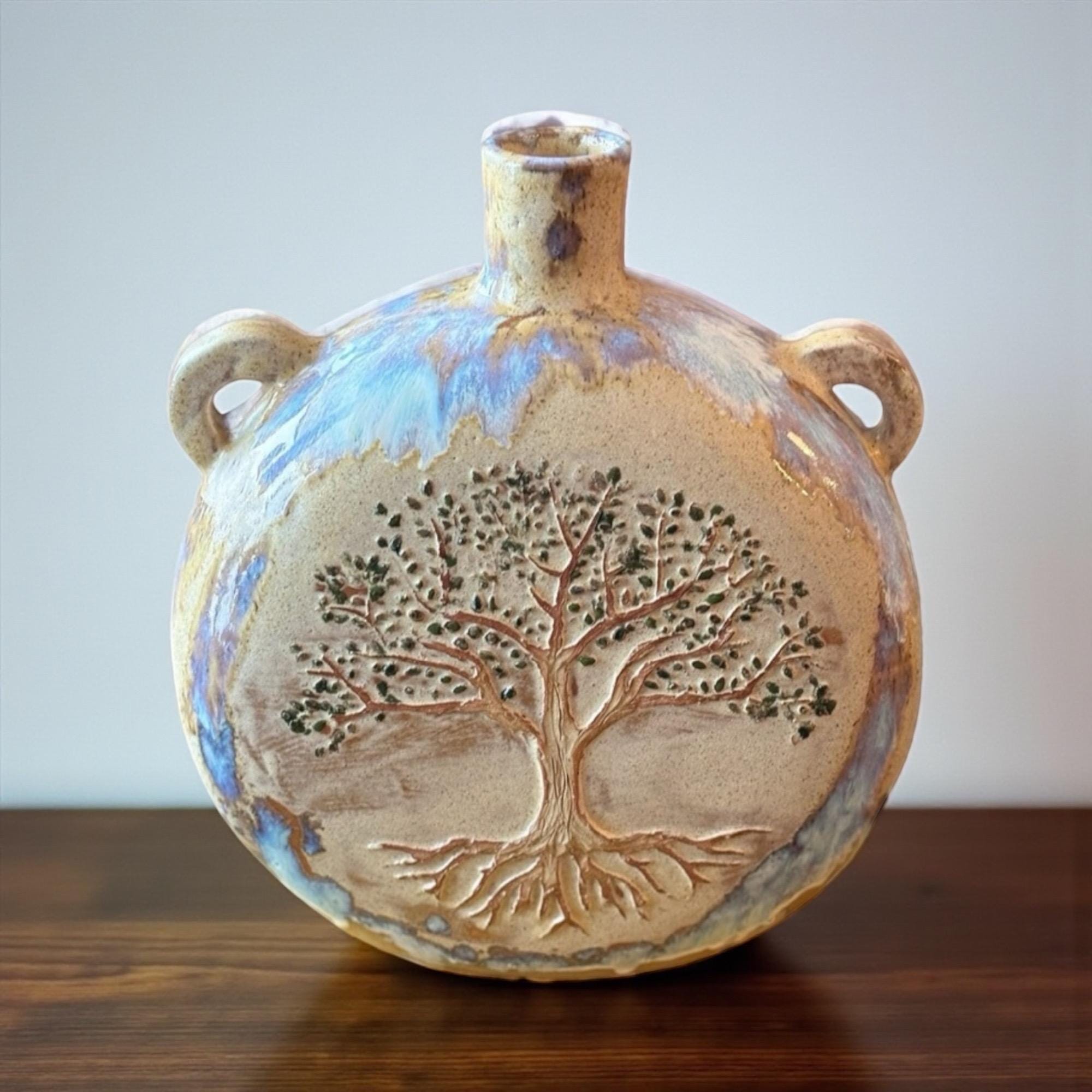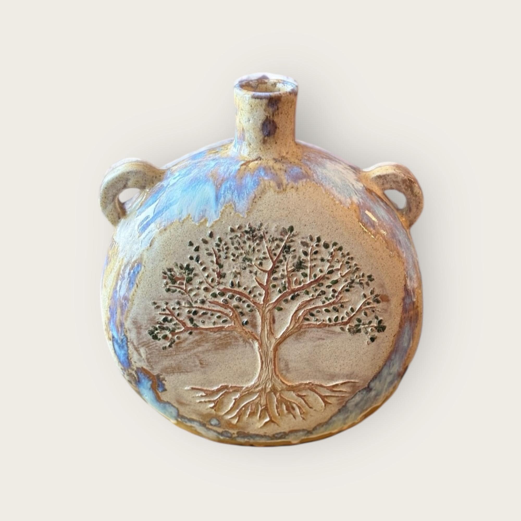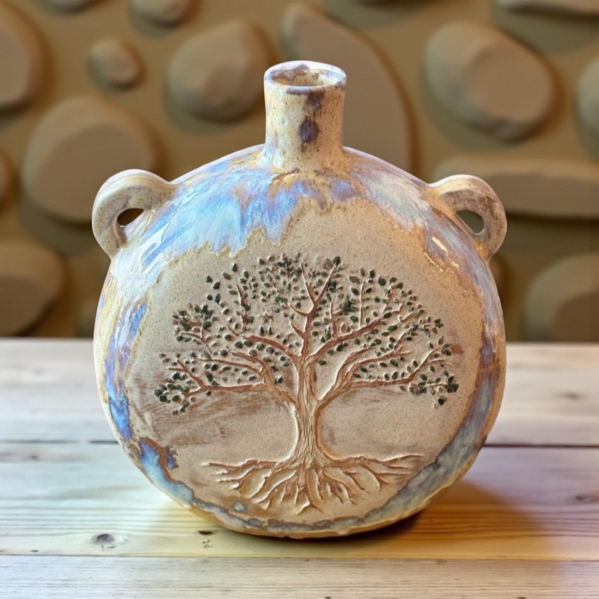 Diese besondere Vase wurde von Hand aus Tonplatten aufgebaut – kein Drehstück, sondern echte Modellierarbeit. Der plastisch geformte Lebensbaum auf der Vorderseite steht für Verwurzelung, Lebenskraft und Wachstum – spürbar in der Struktur und sichtbar in jedem Detail. Eine Vase wie ein stilles Symbol: kraftvoll, naturverbunden, einzigartig.