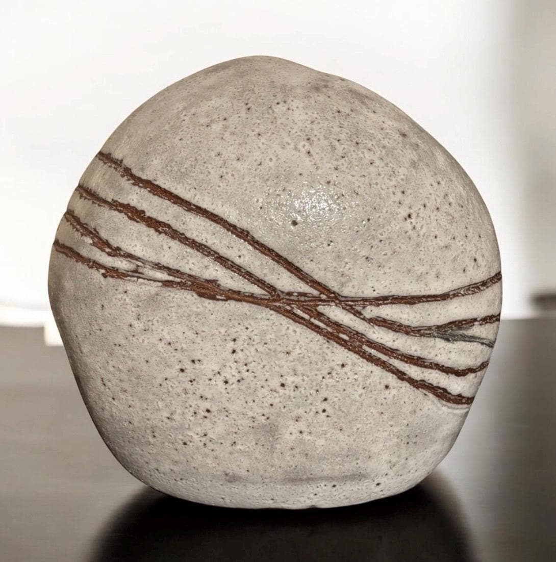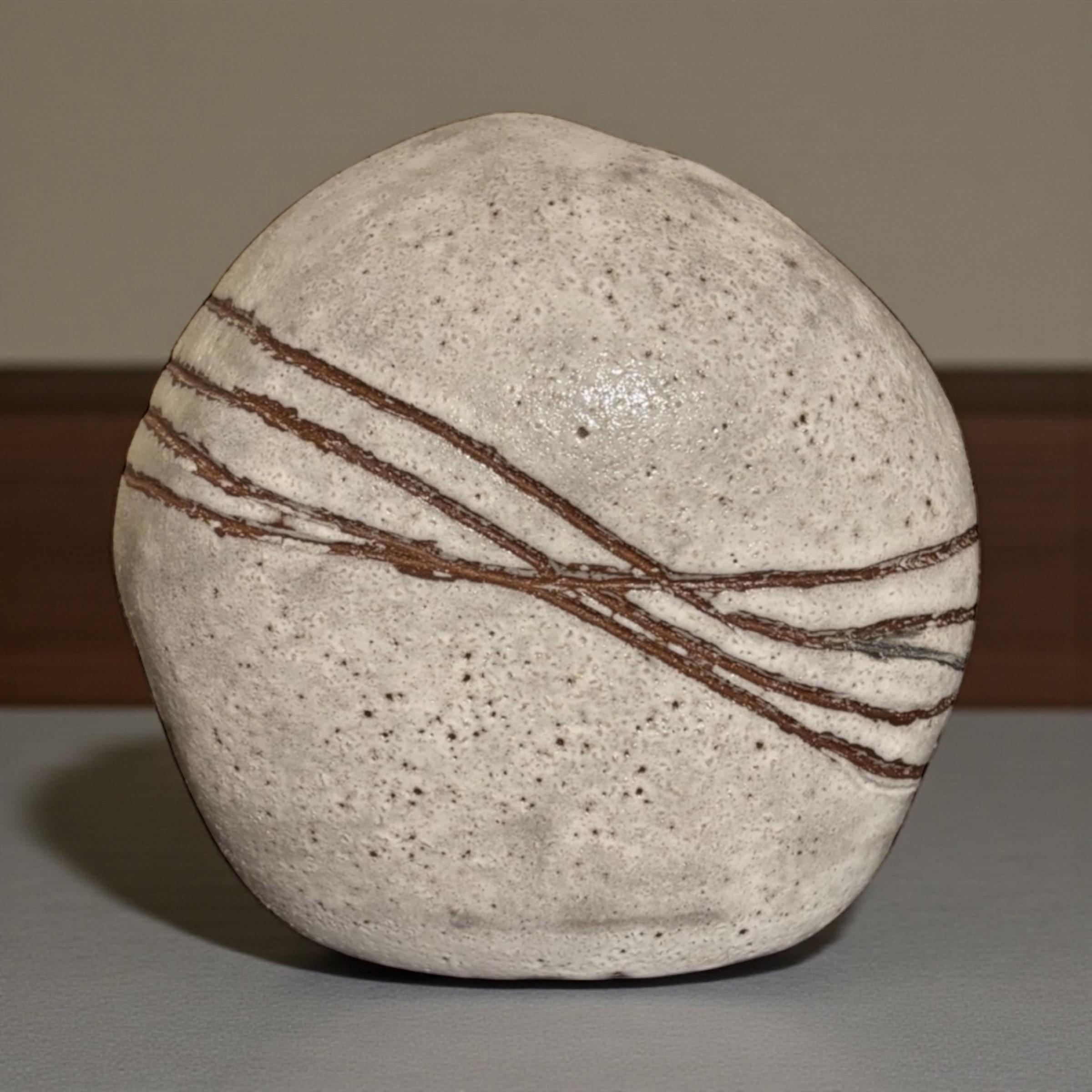 This vase is more than a vessel—it is a still feeling. Its form appears frozen in motion: bands stretch across the surface, as if trying to hold something—or release it. The open-pored, white-glazed surface is reminiscent of natural stone—raw, vibrant, real.