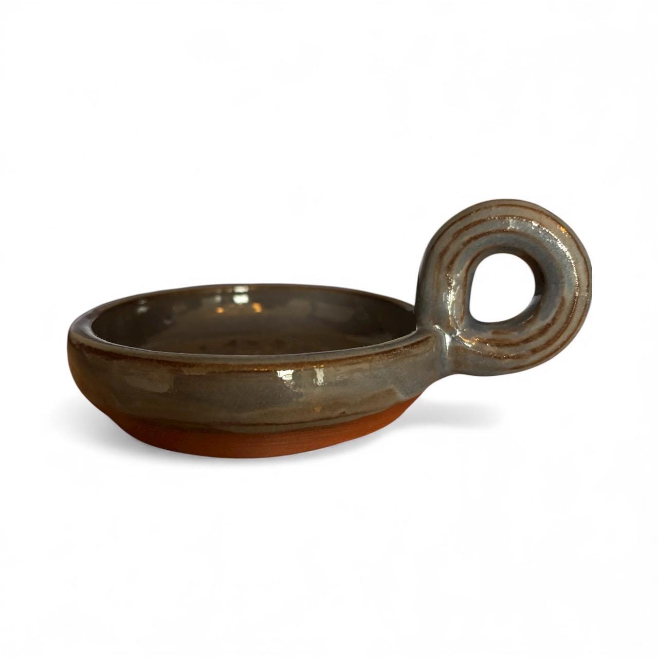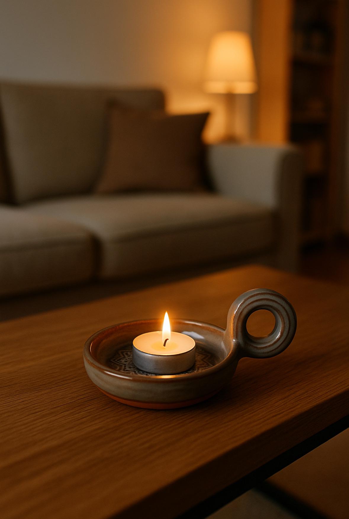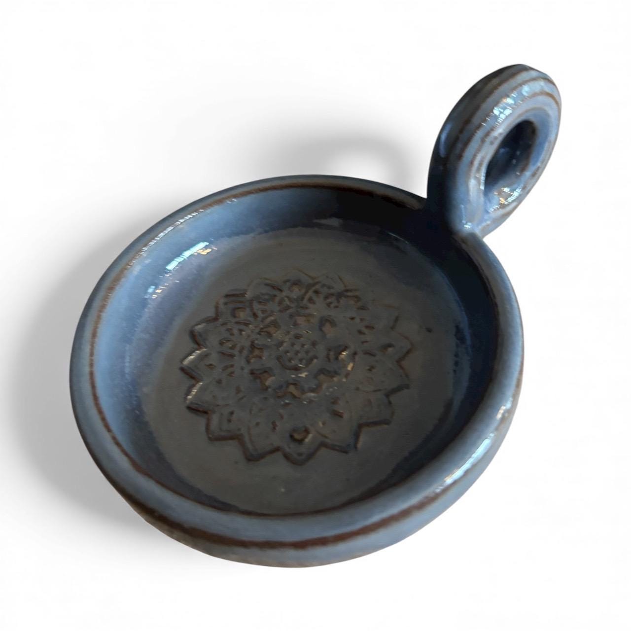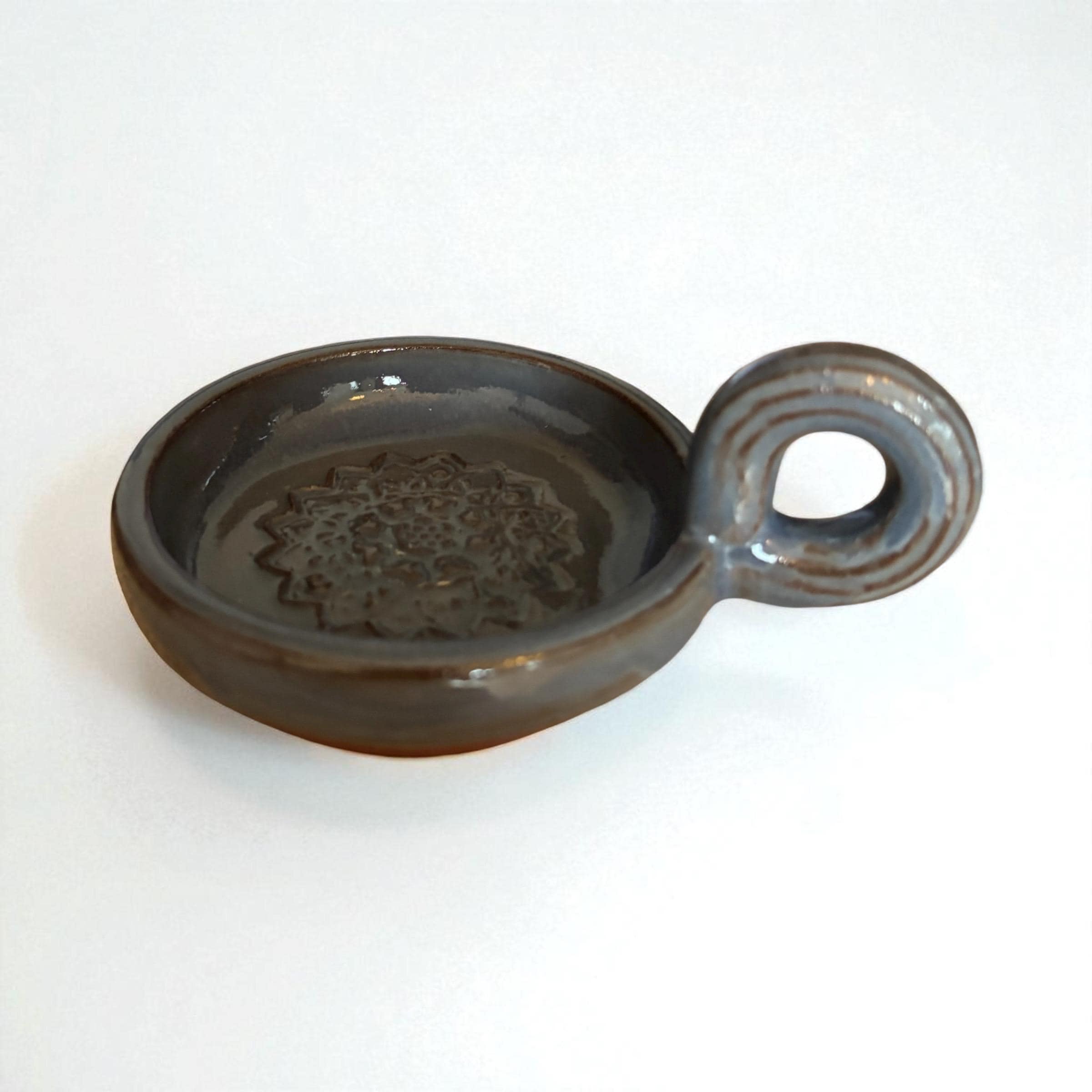 The plate measures 8 cm in diameter (base 7.5 cm) and is ideal for pillar candles up to 7 cm. The 2 cm high rim ensures no spillage, and the round handle makes it particularly comfortable to lift. A unique piece that plays a special role on the dining table, windowsill, or in Advent arrangements.