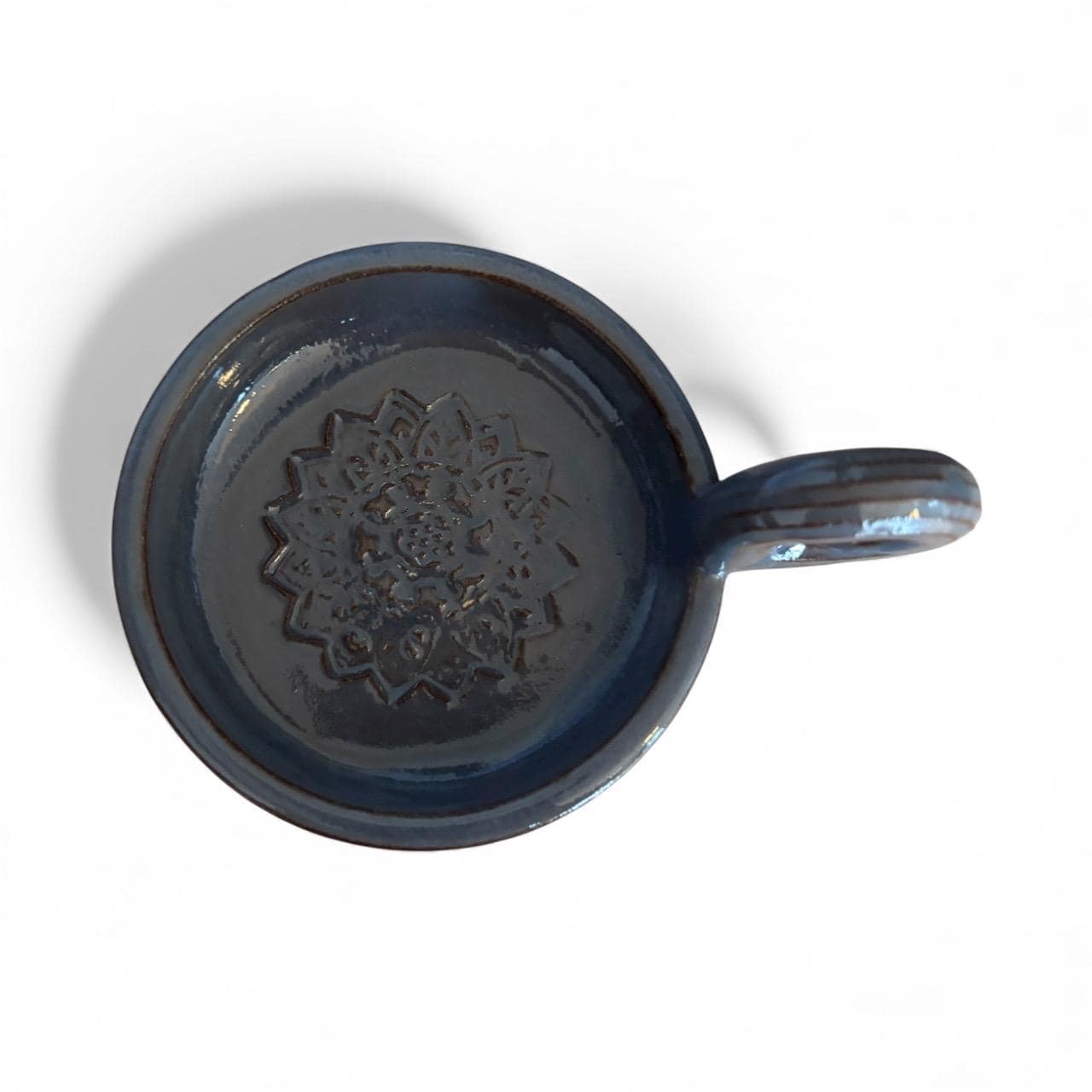 This hand-thrown ceramic candle holder from my studio, MABA, brings warmth and atmosphere to your home. The gray-blue (topaz blue) glaze is reminiscent of clear autumn evenings and is just as perfect for the festive Christmas season. The delicate pattern on the base is particularly beautiful, subtly highlighted by the glaze and lends the piece a special depth.