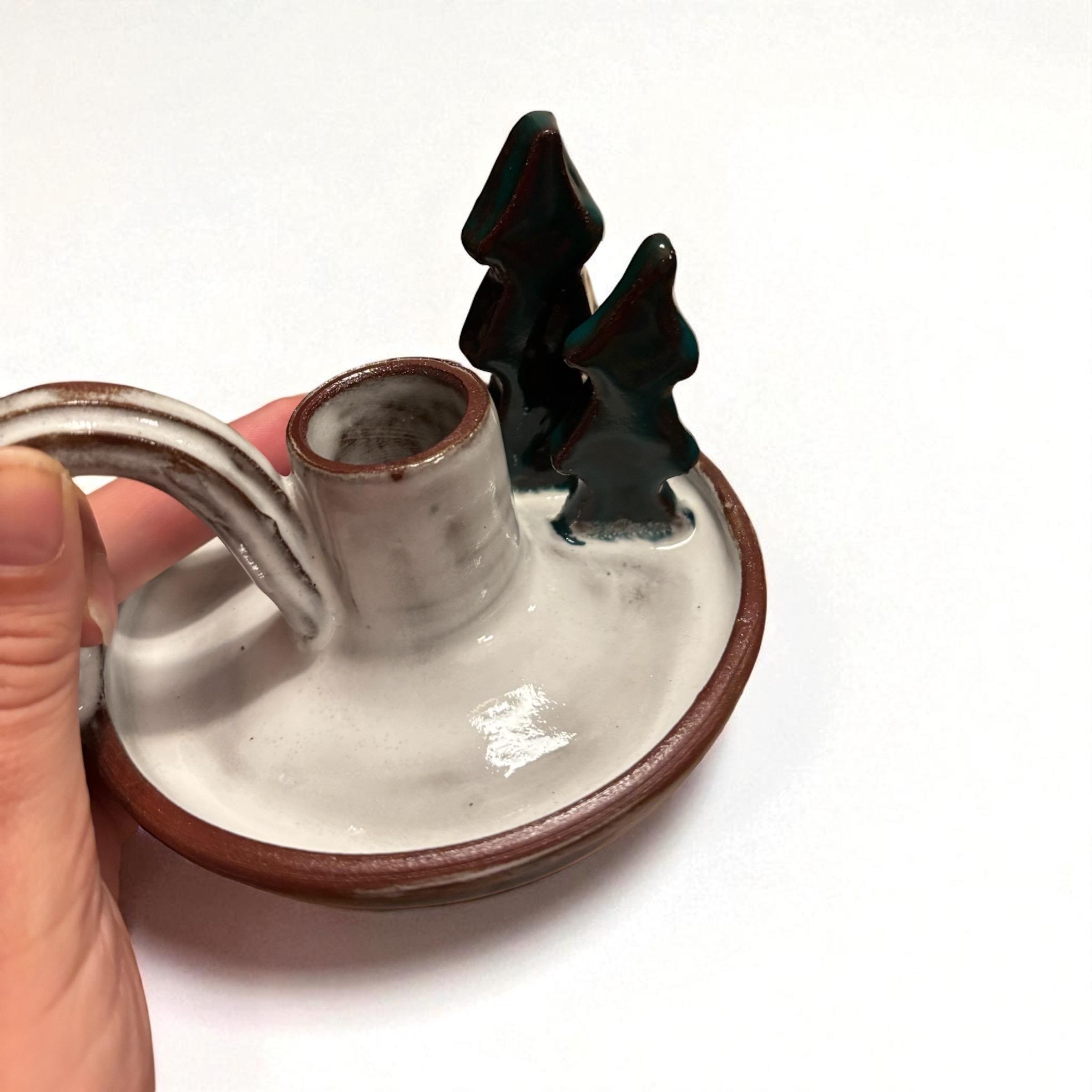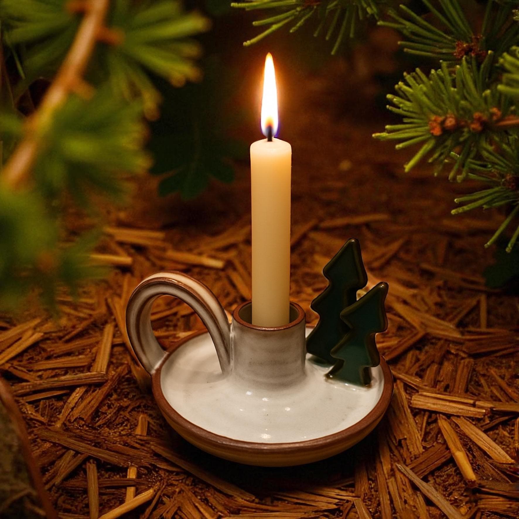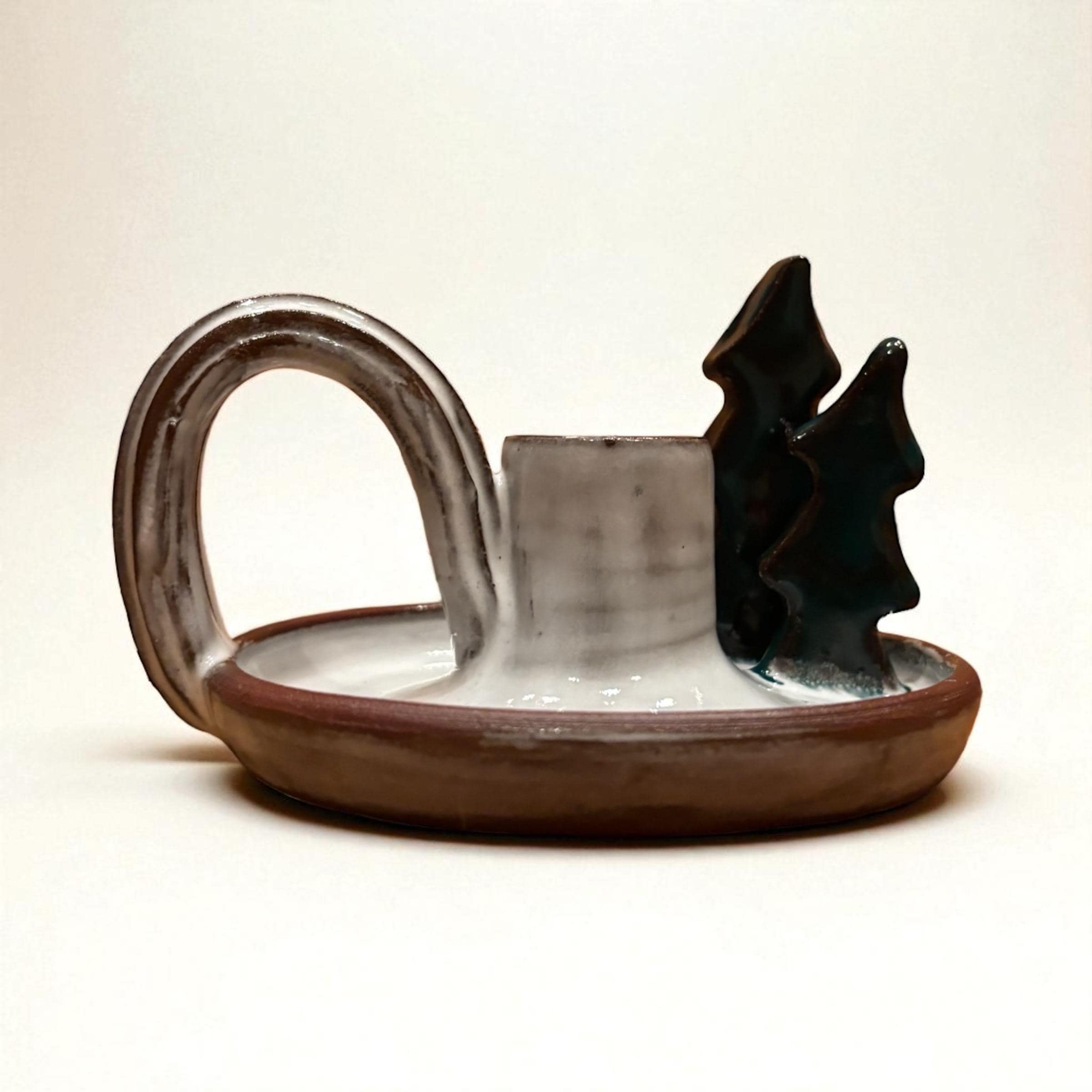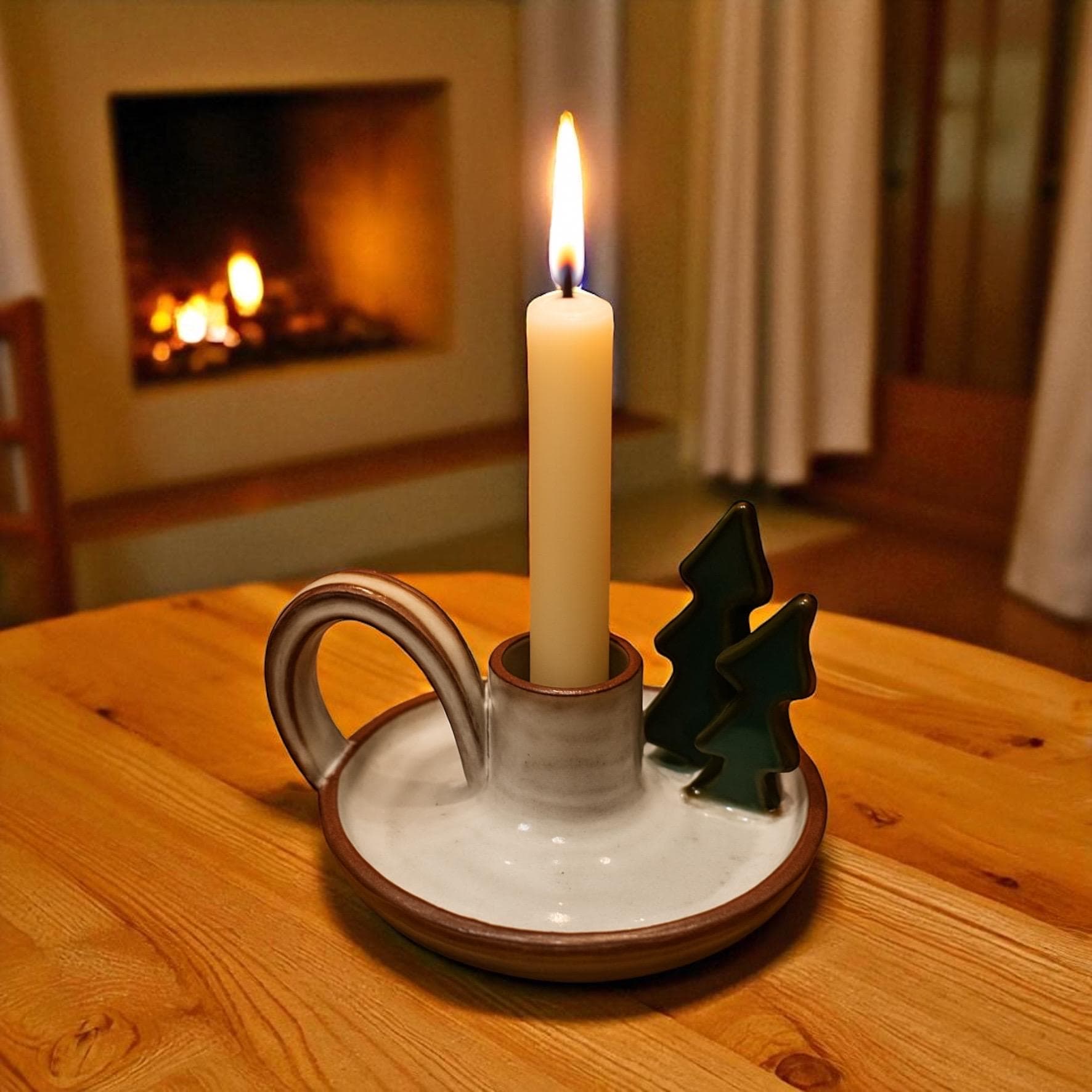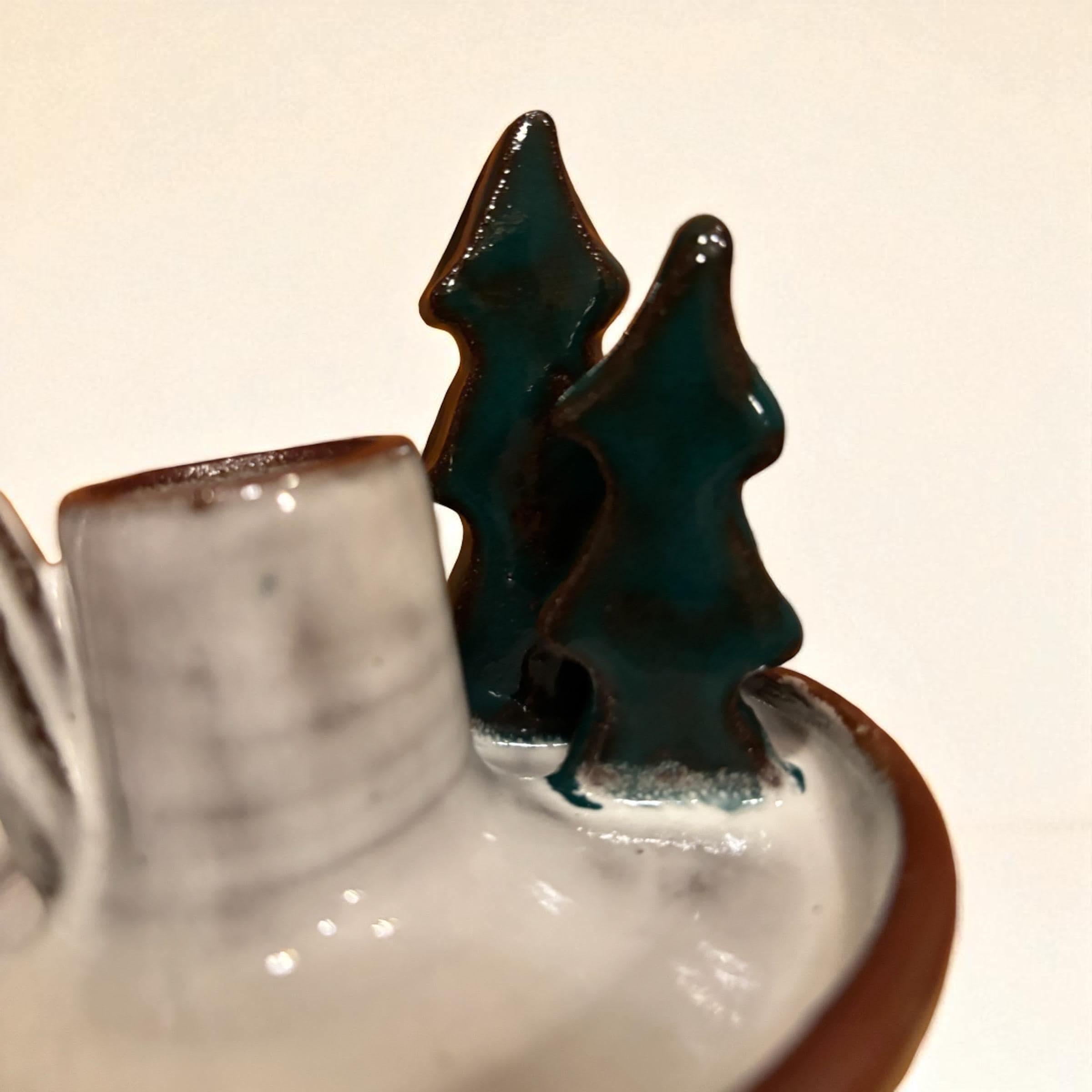 Handgefertigter Kerzenhalter aus Steinzeug mit Tannenbäumen