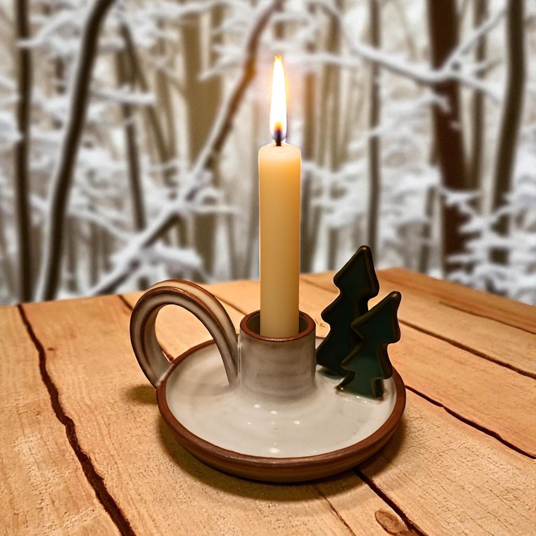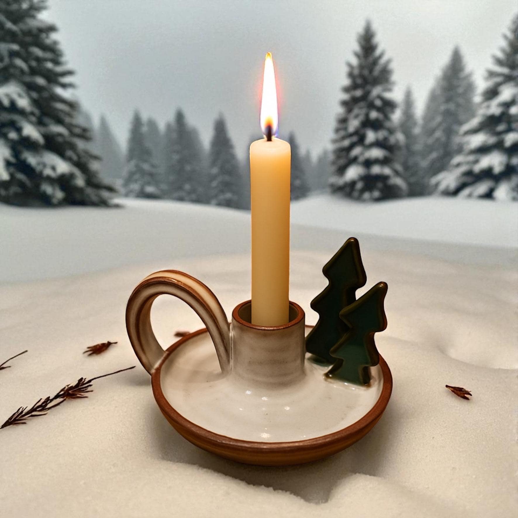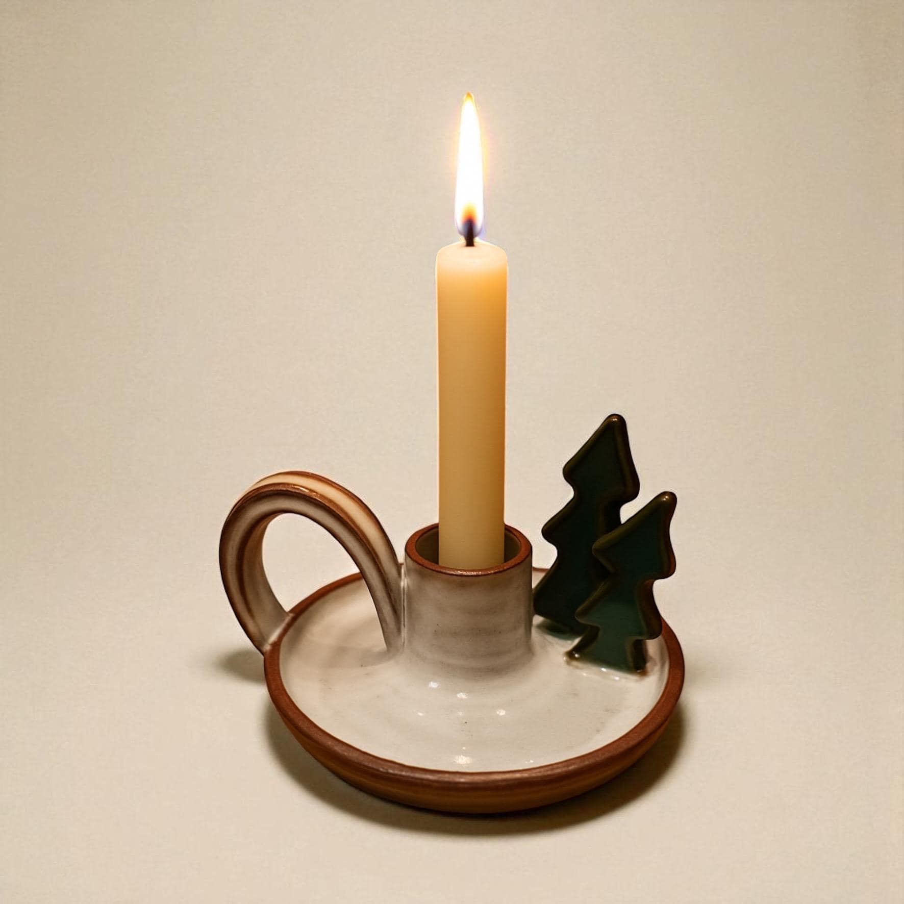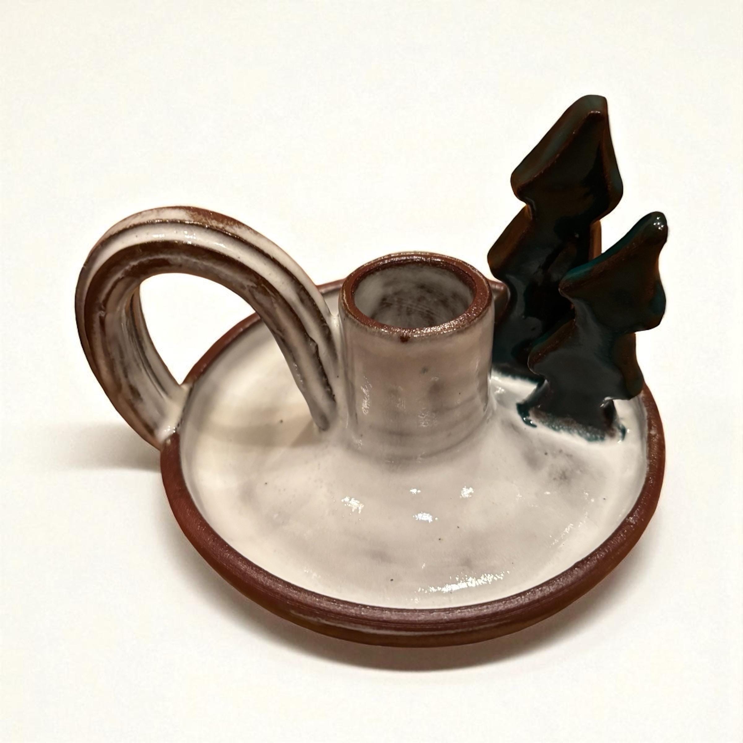 Handgefertigter Kerzenhalter aus Steinzeug mit Tannenbäumen
