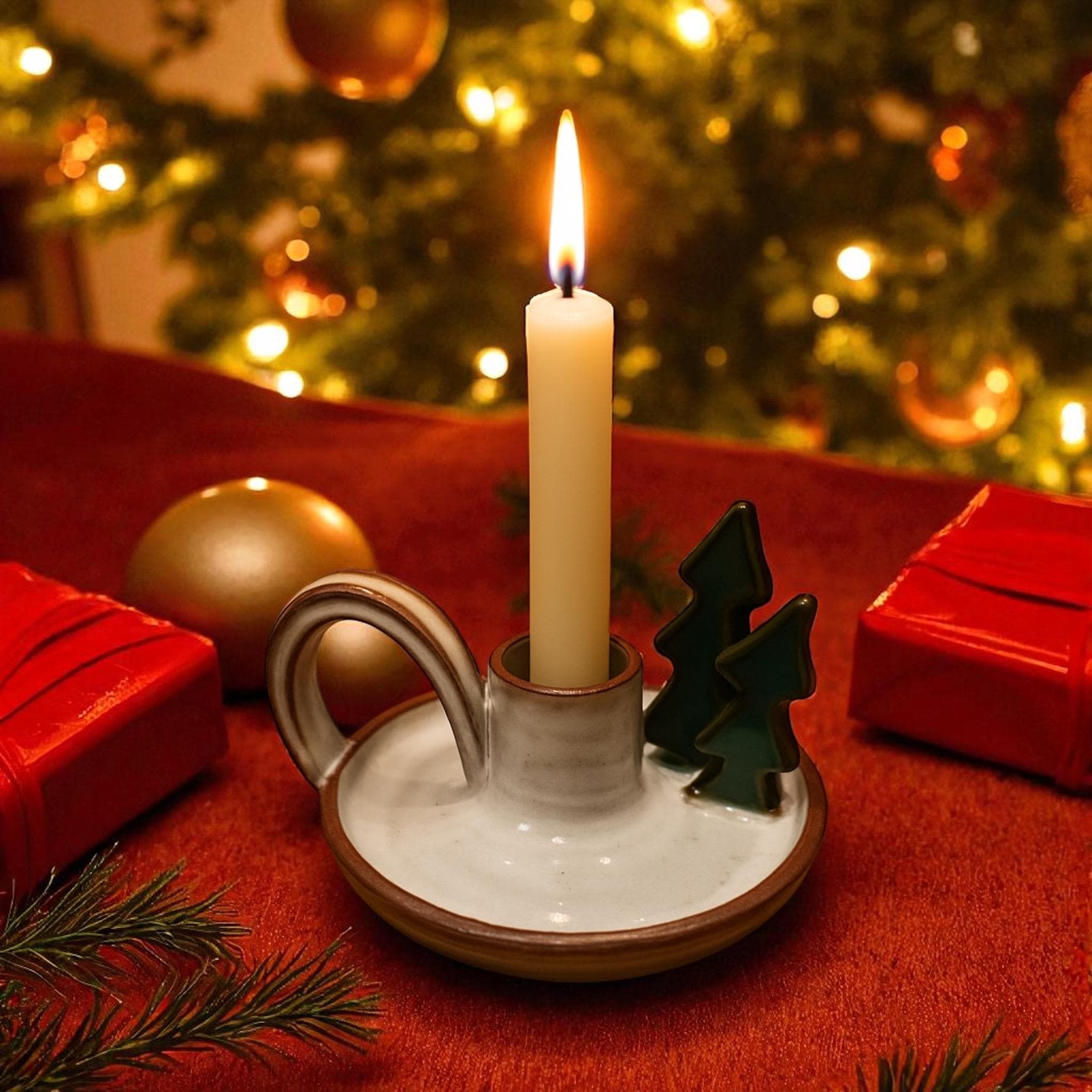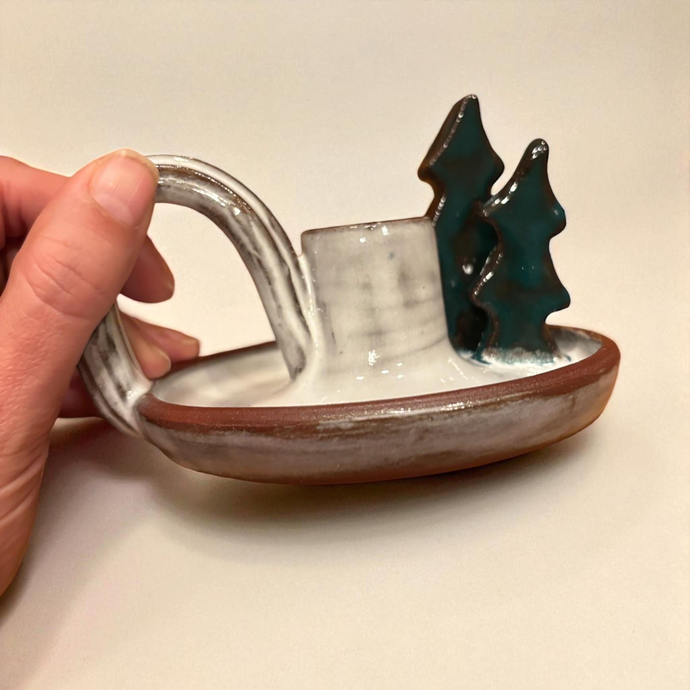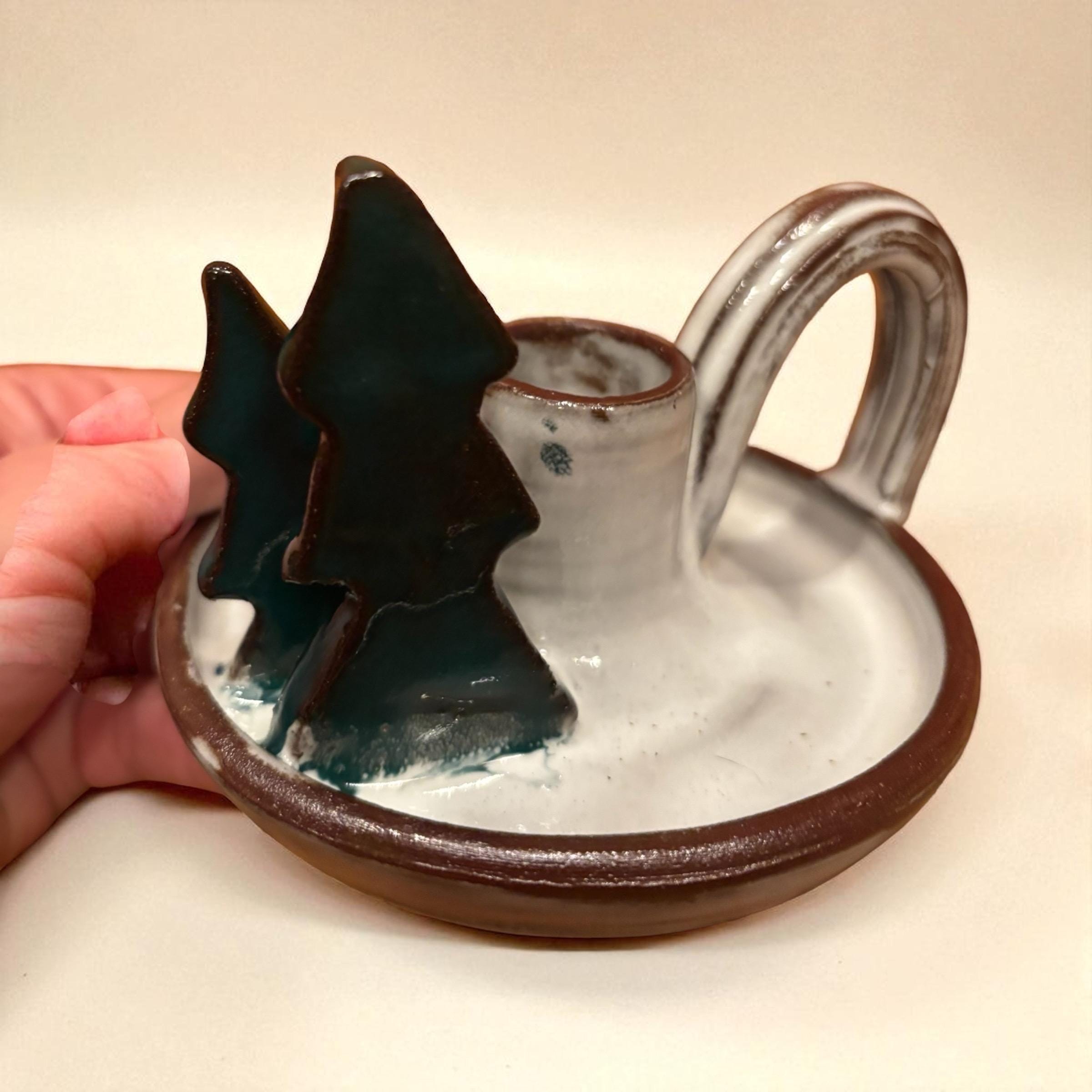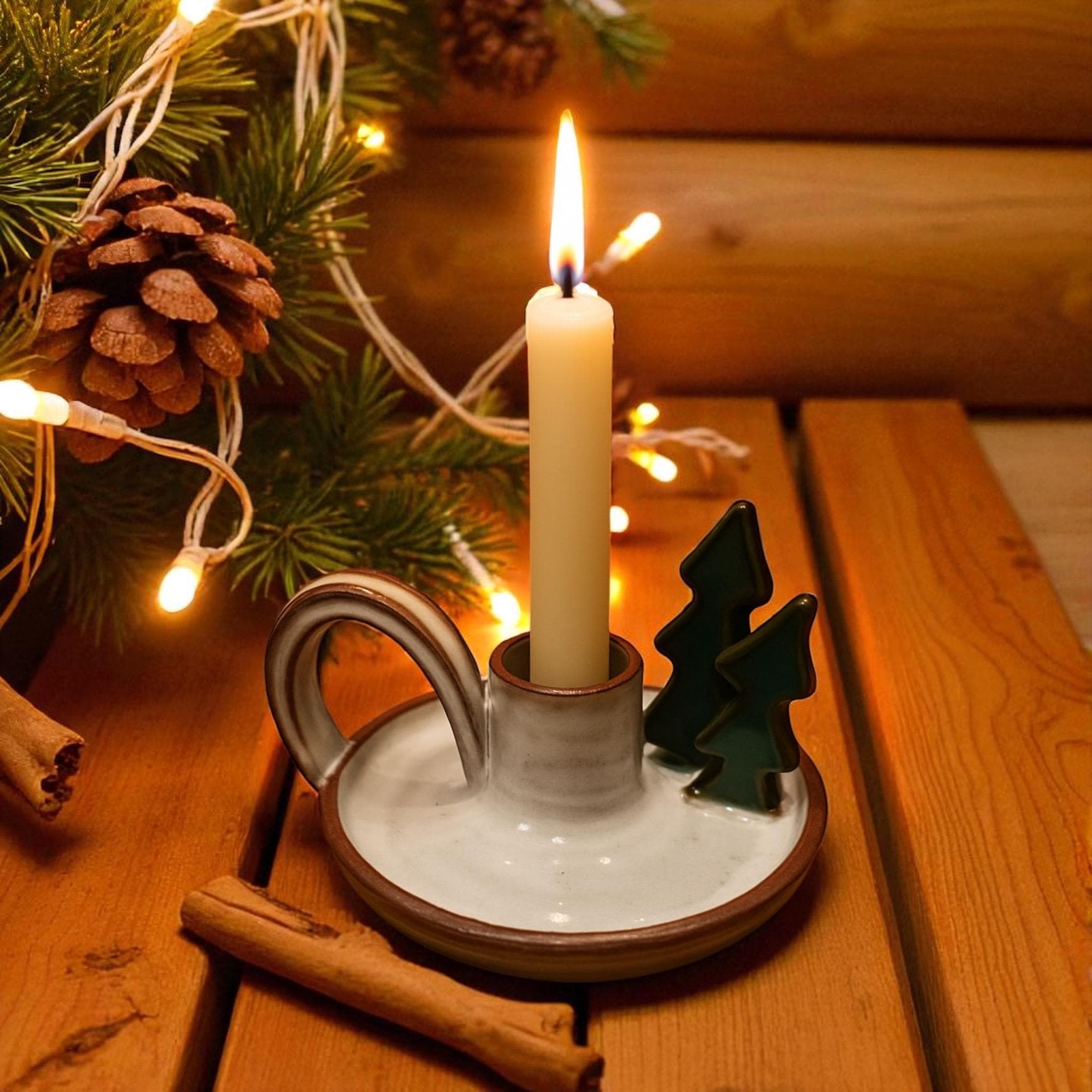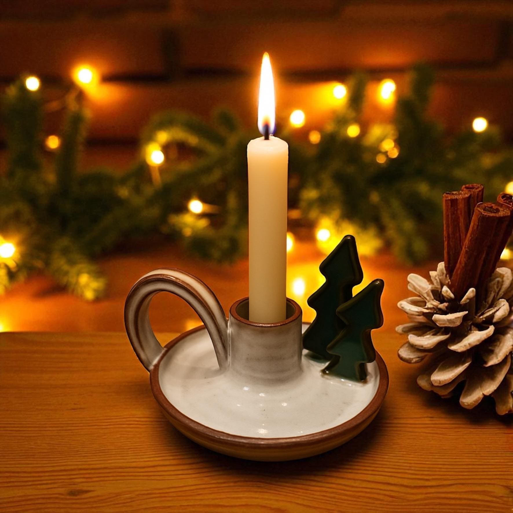 Handgefertigter Kerzenhalter aus Steinzeug mit Tannenbäumen