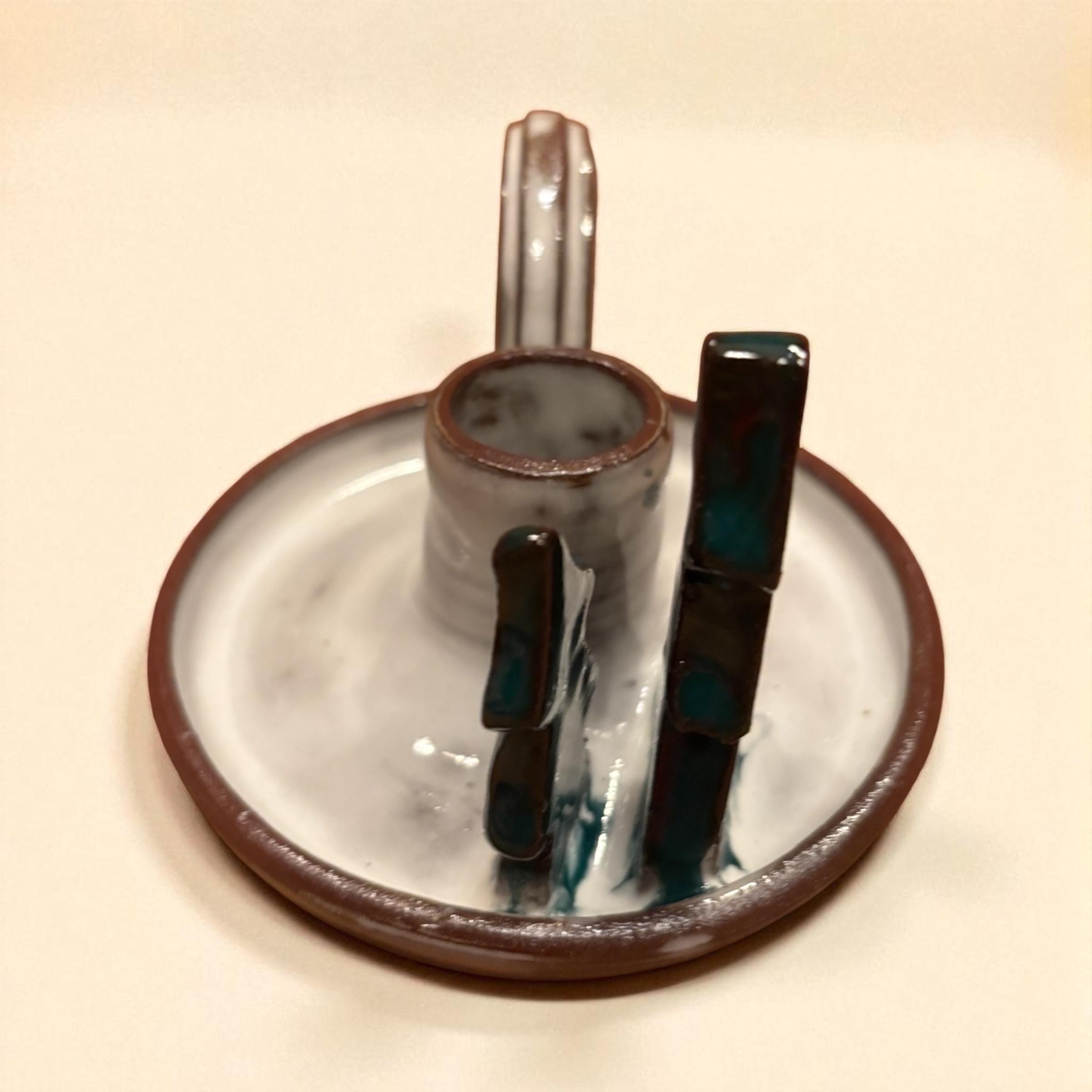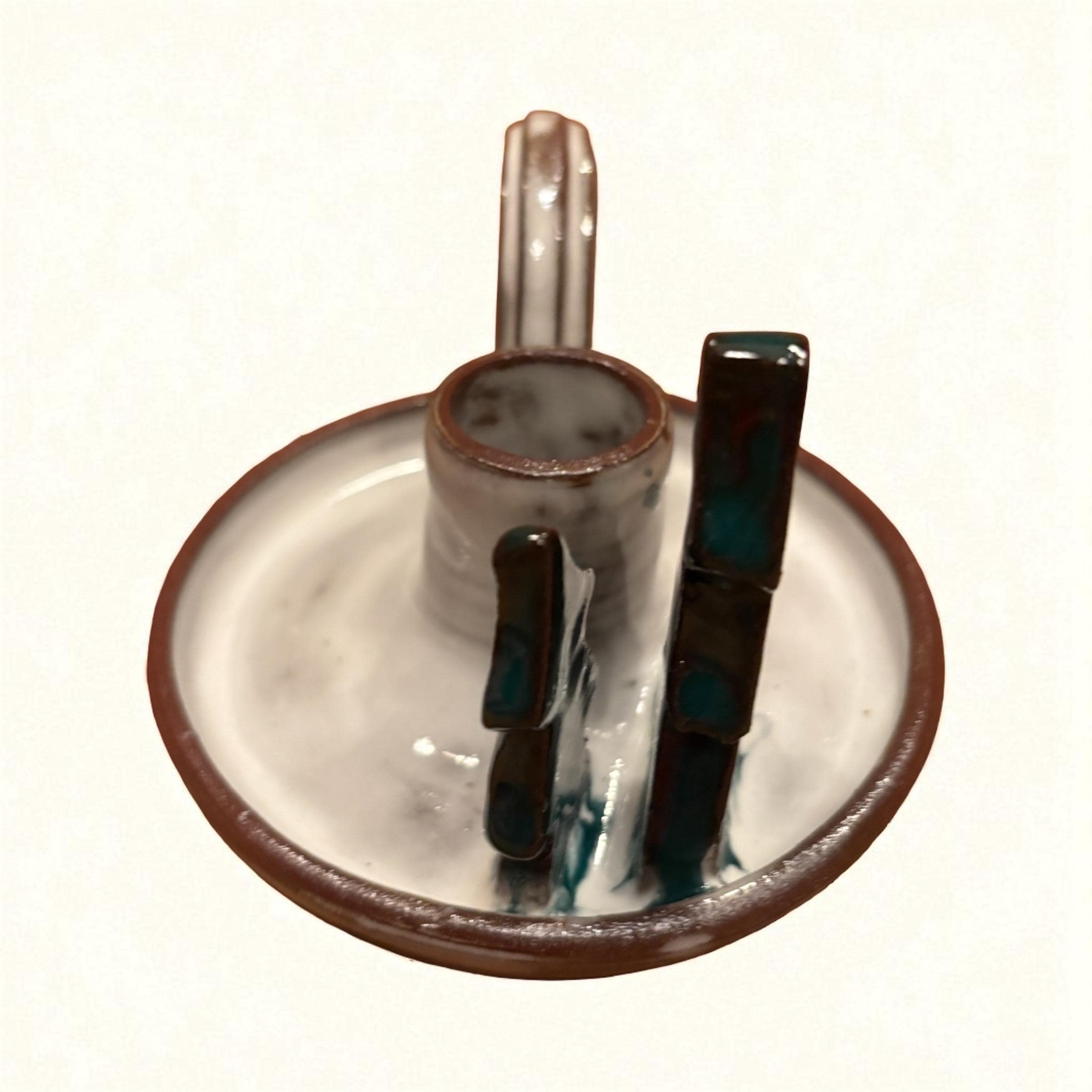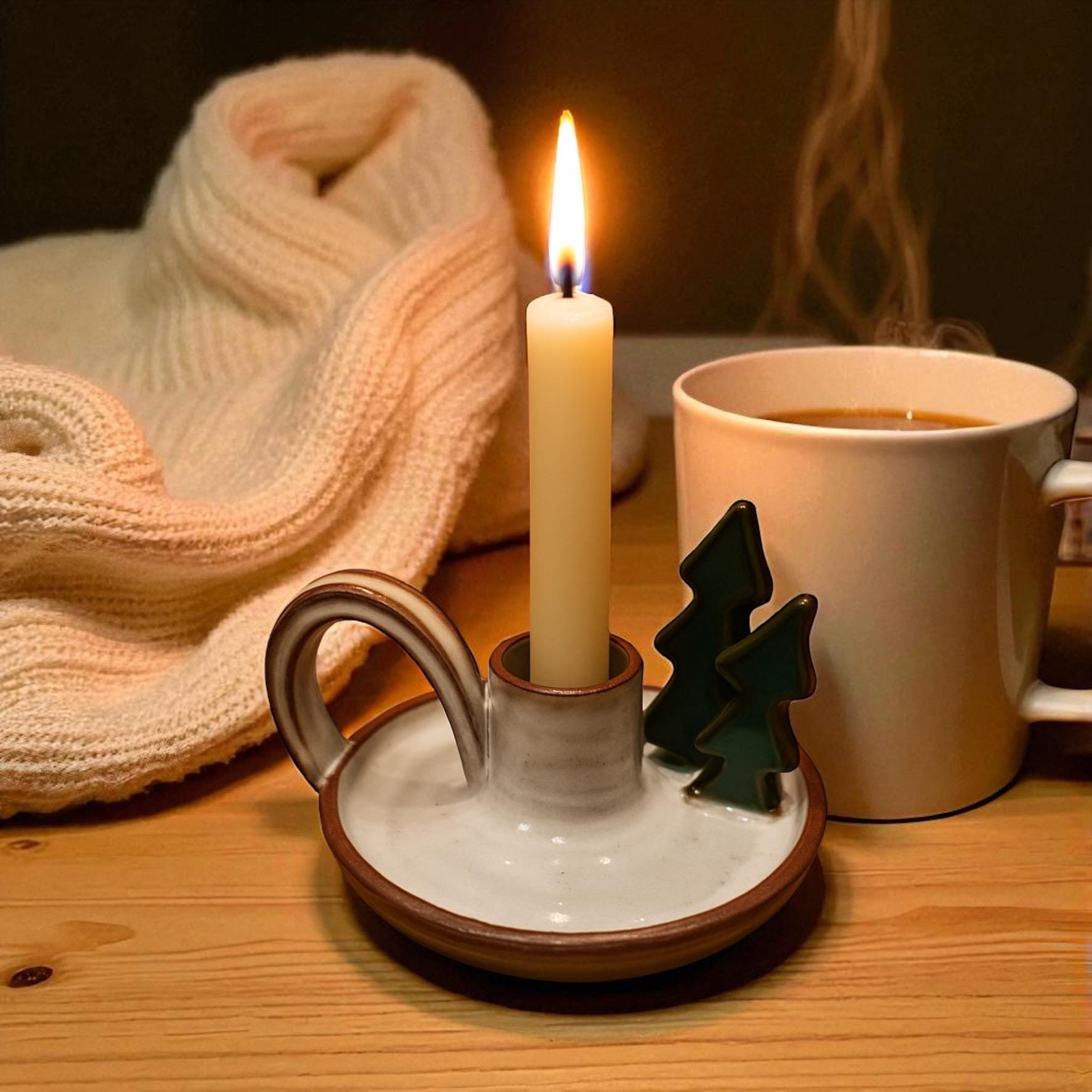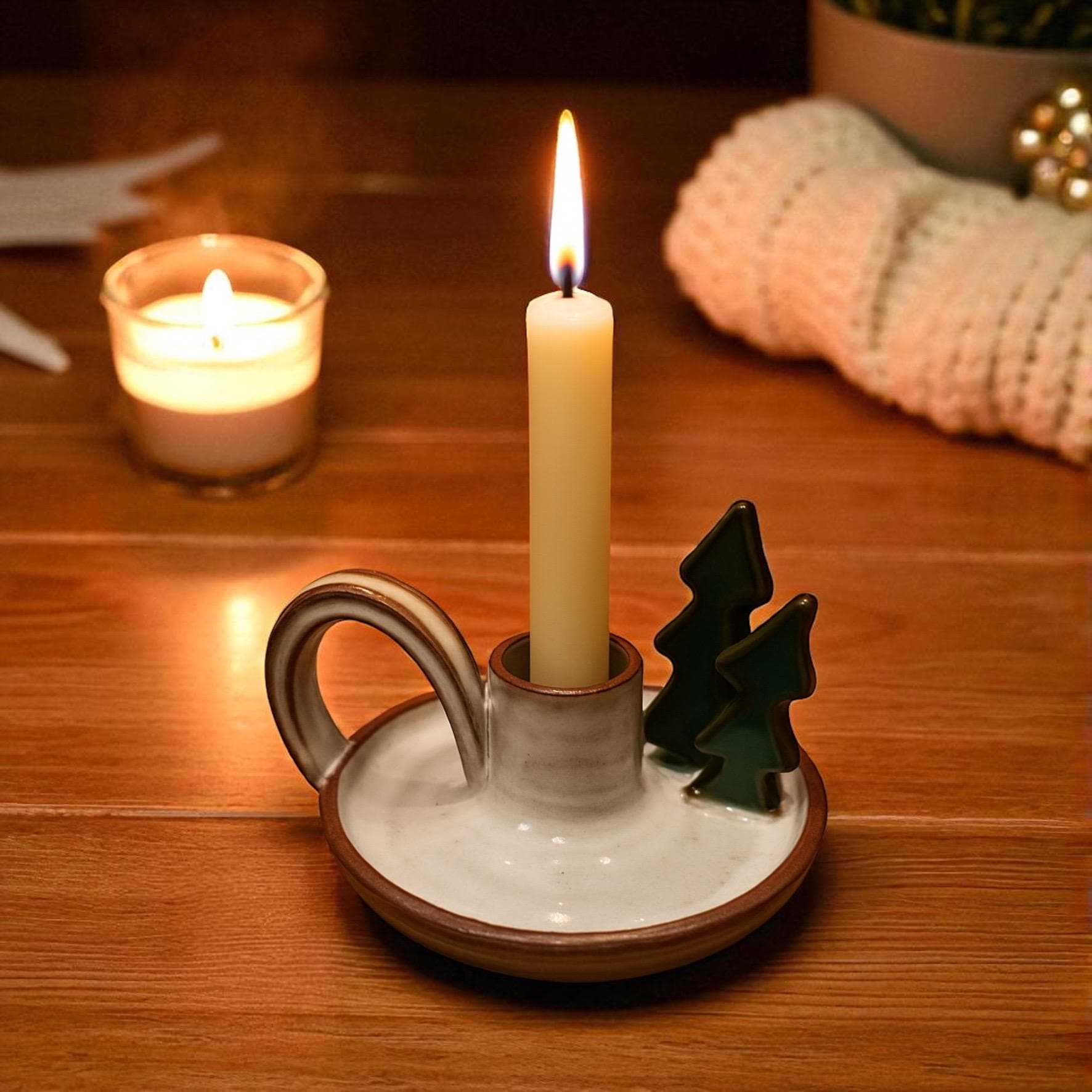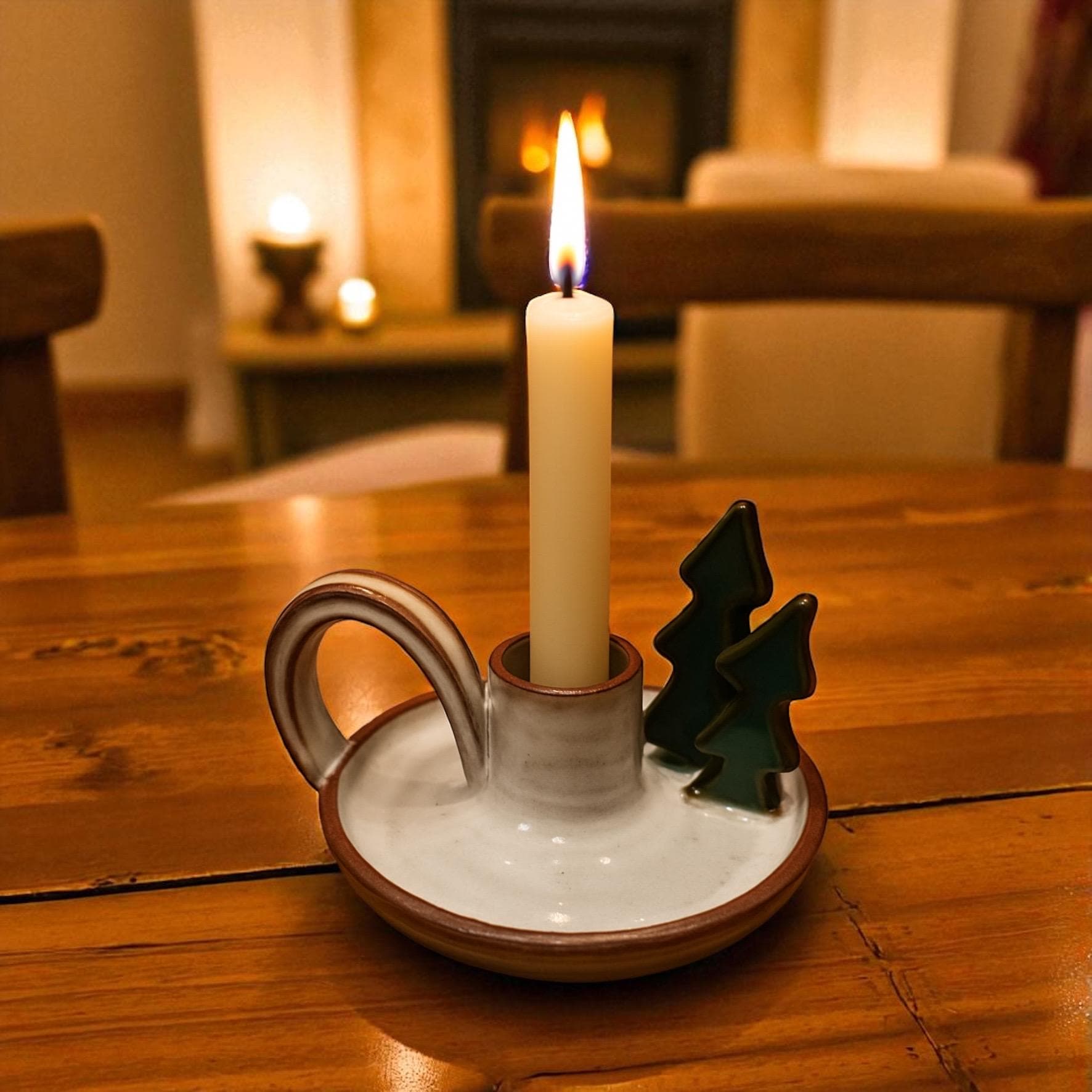 Handgefertigter Kerzenhalter aus Steinzeug mit Tannenbäumen