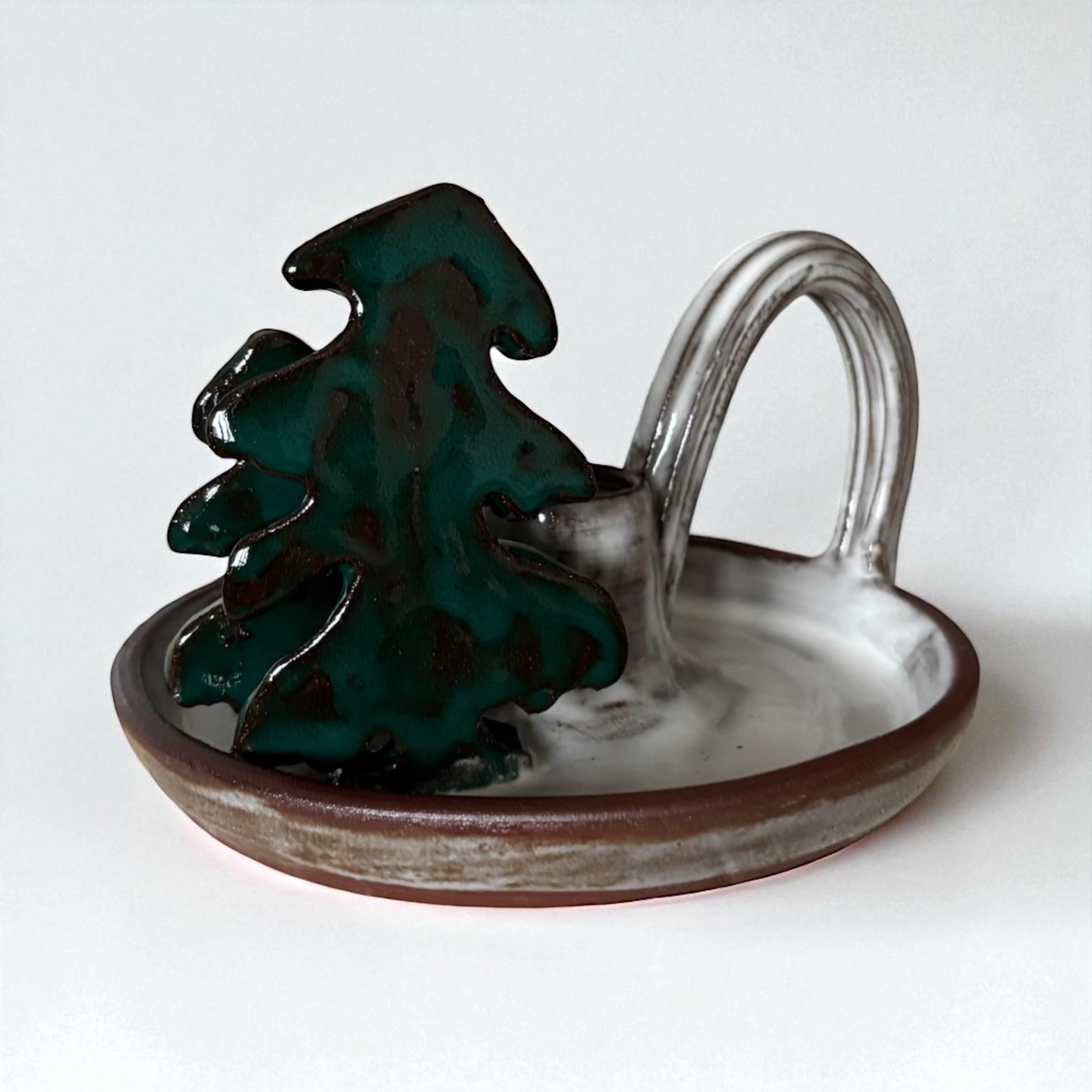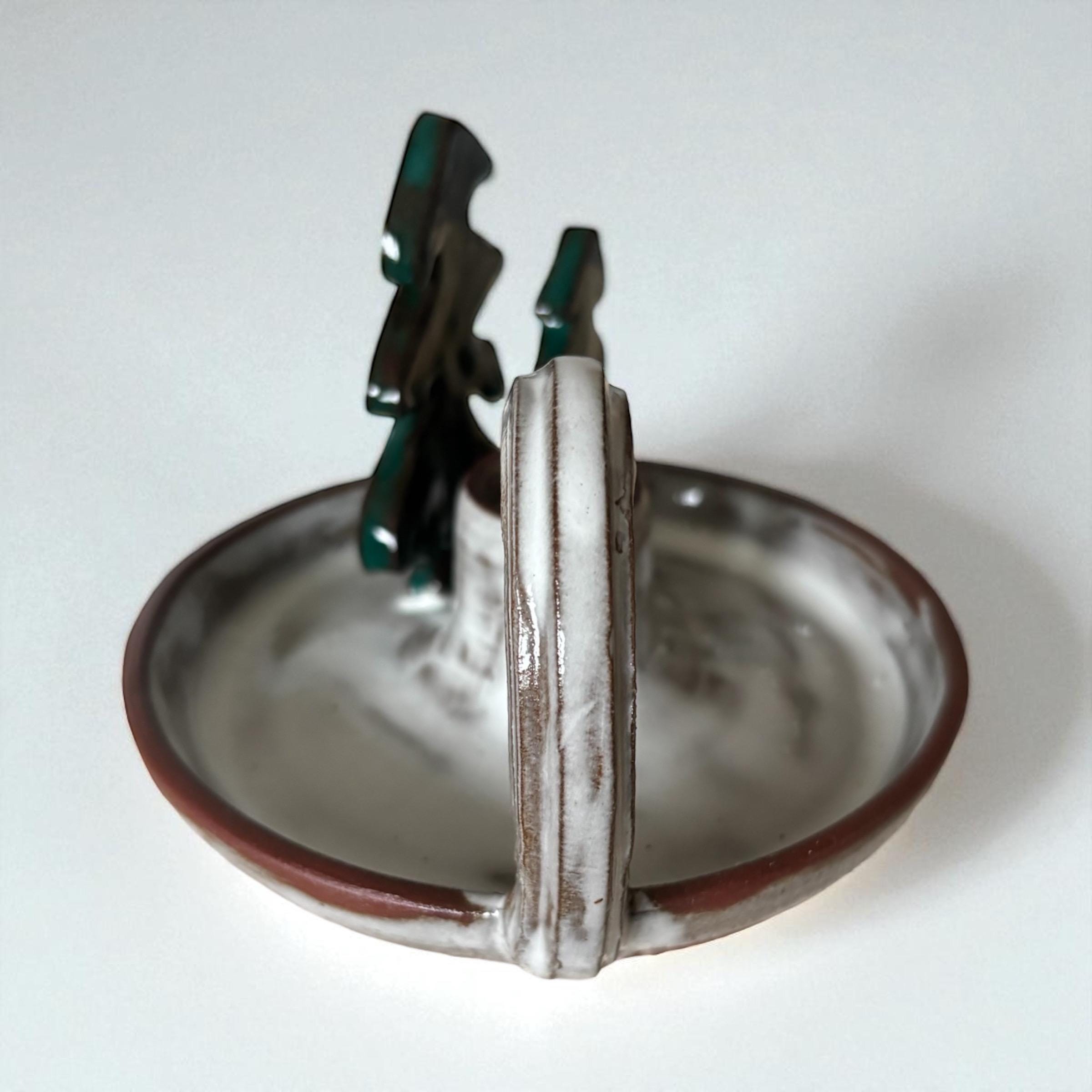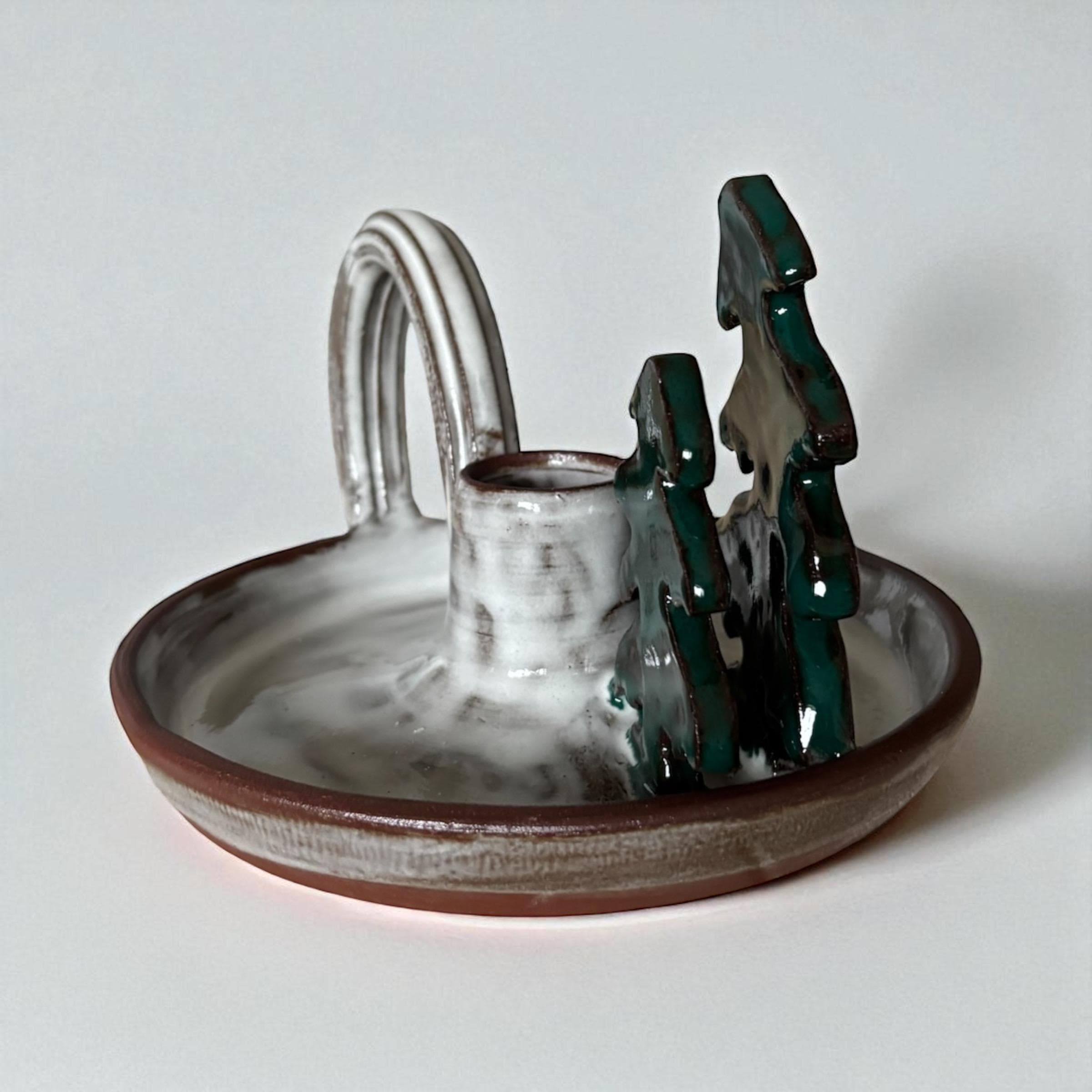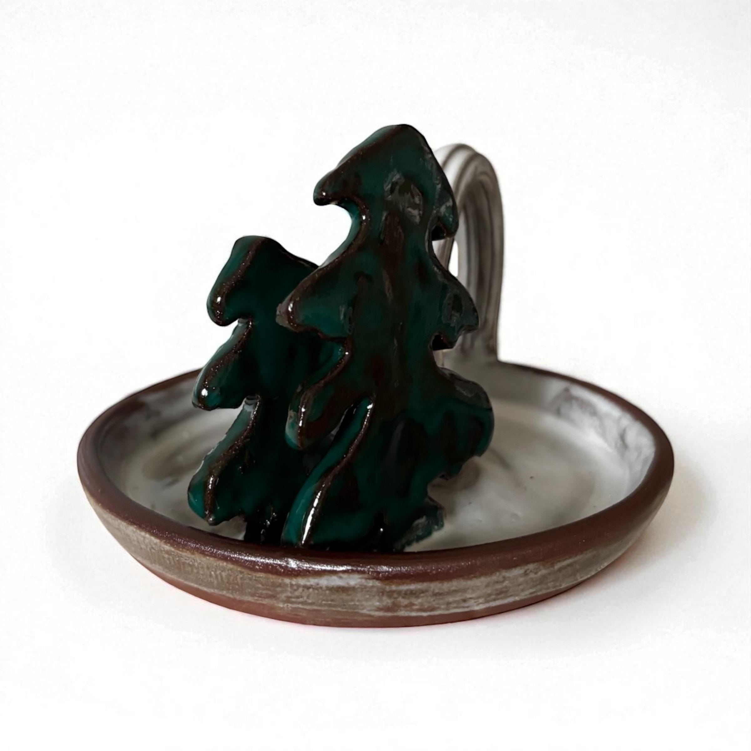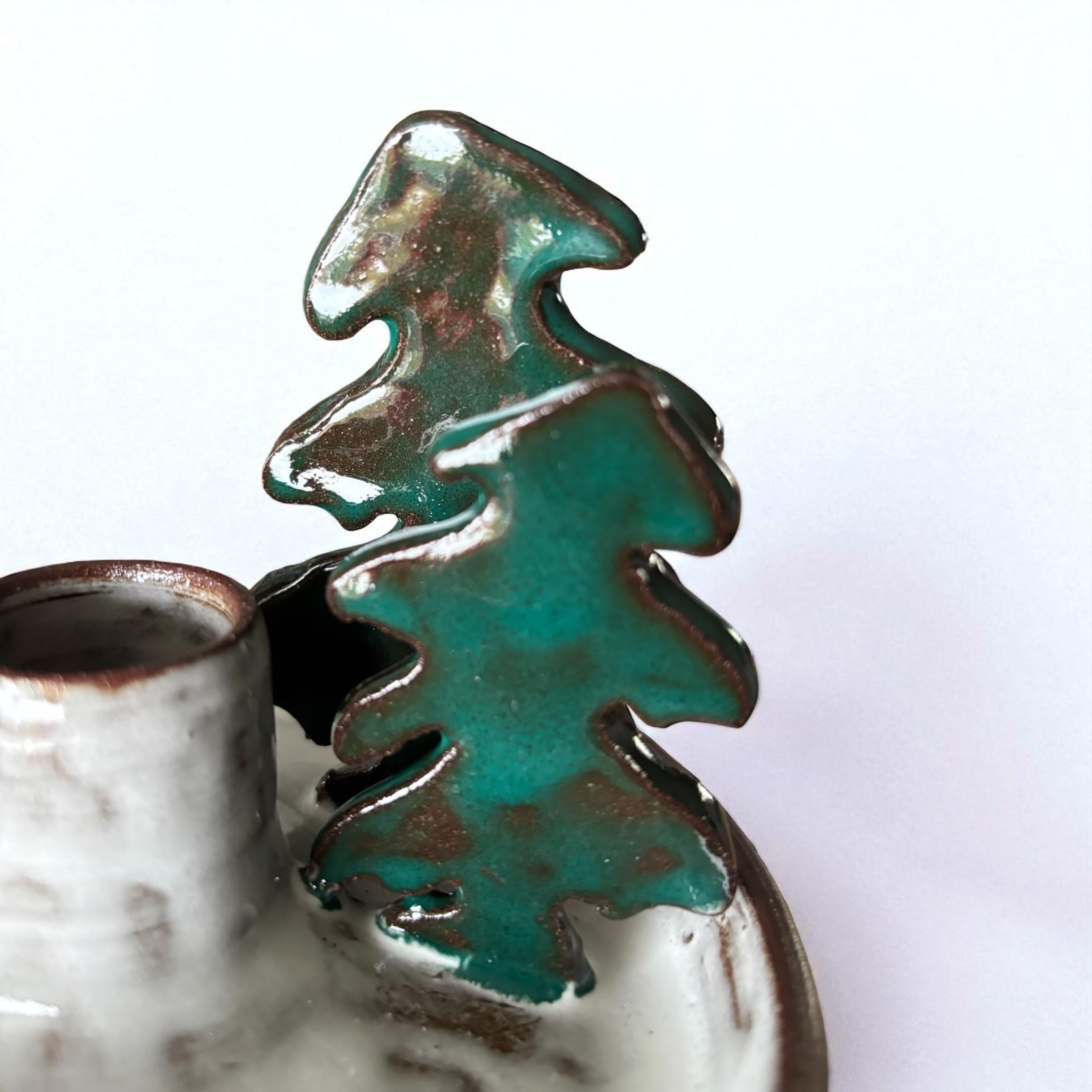 Der Teller ist weiß glasiert – ruhig, hell und fein. Die beiden Tannenbäume tragen eine tiefgrüne, glänzende Glasur, die im Licht lebendig wirkt.
