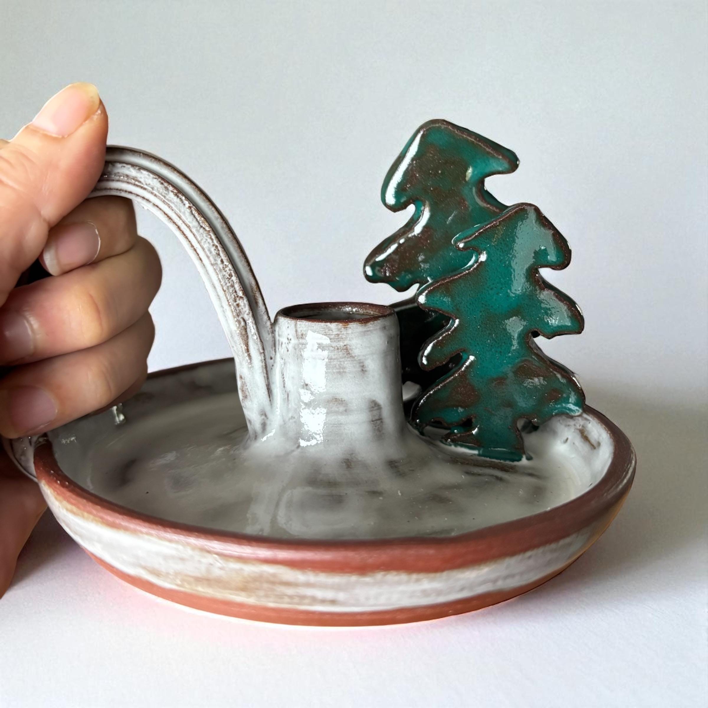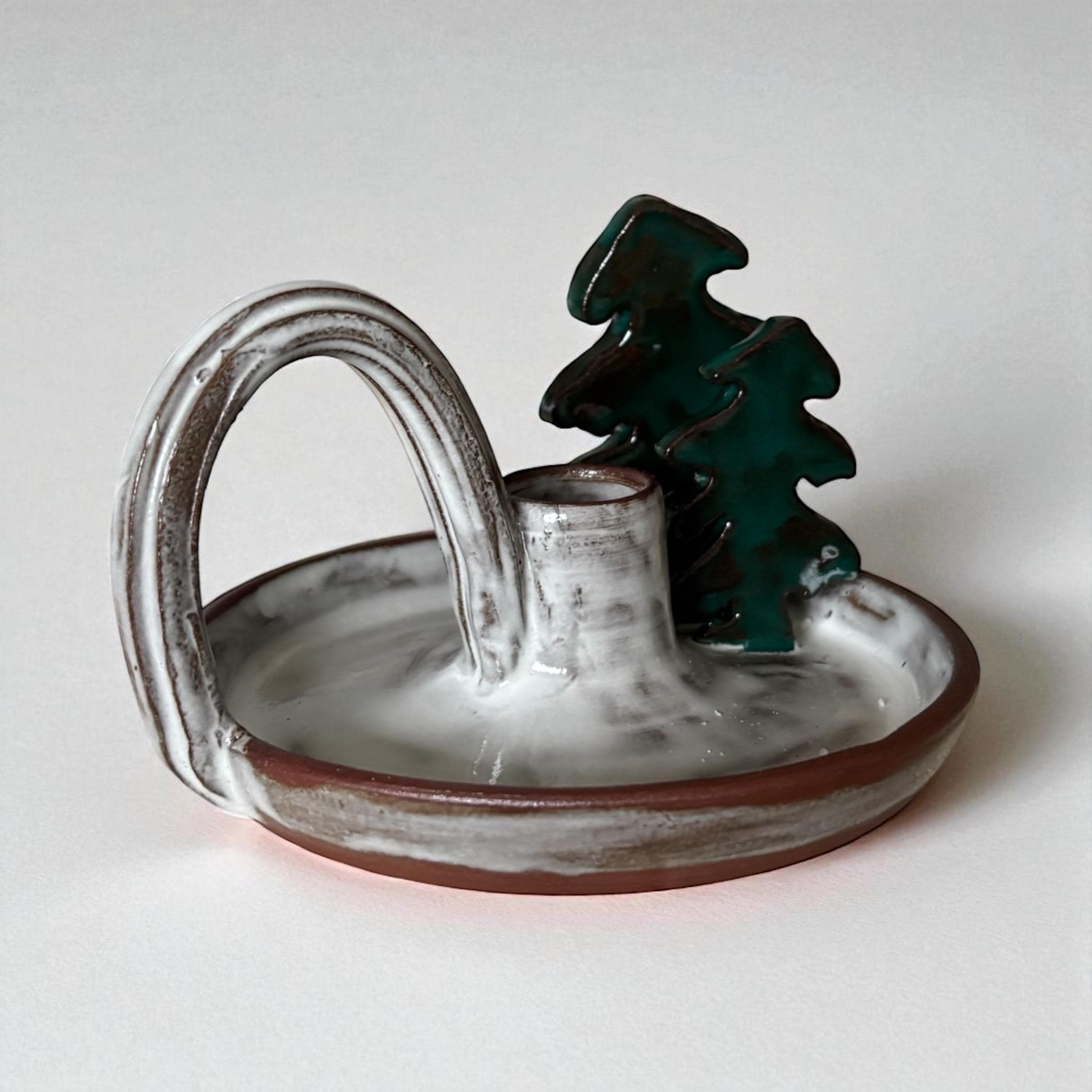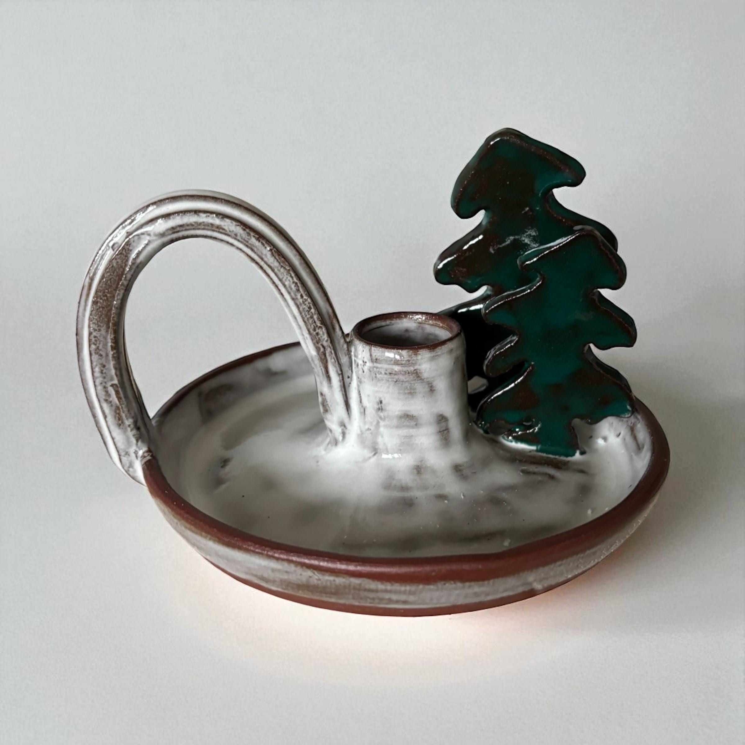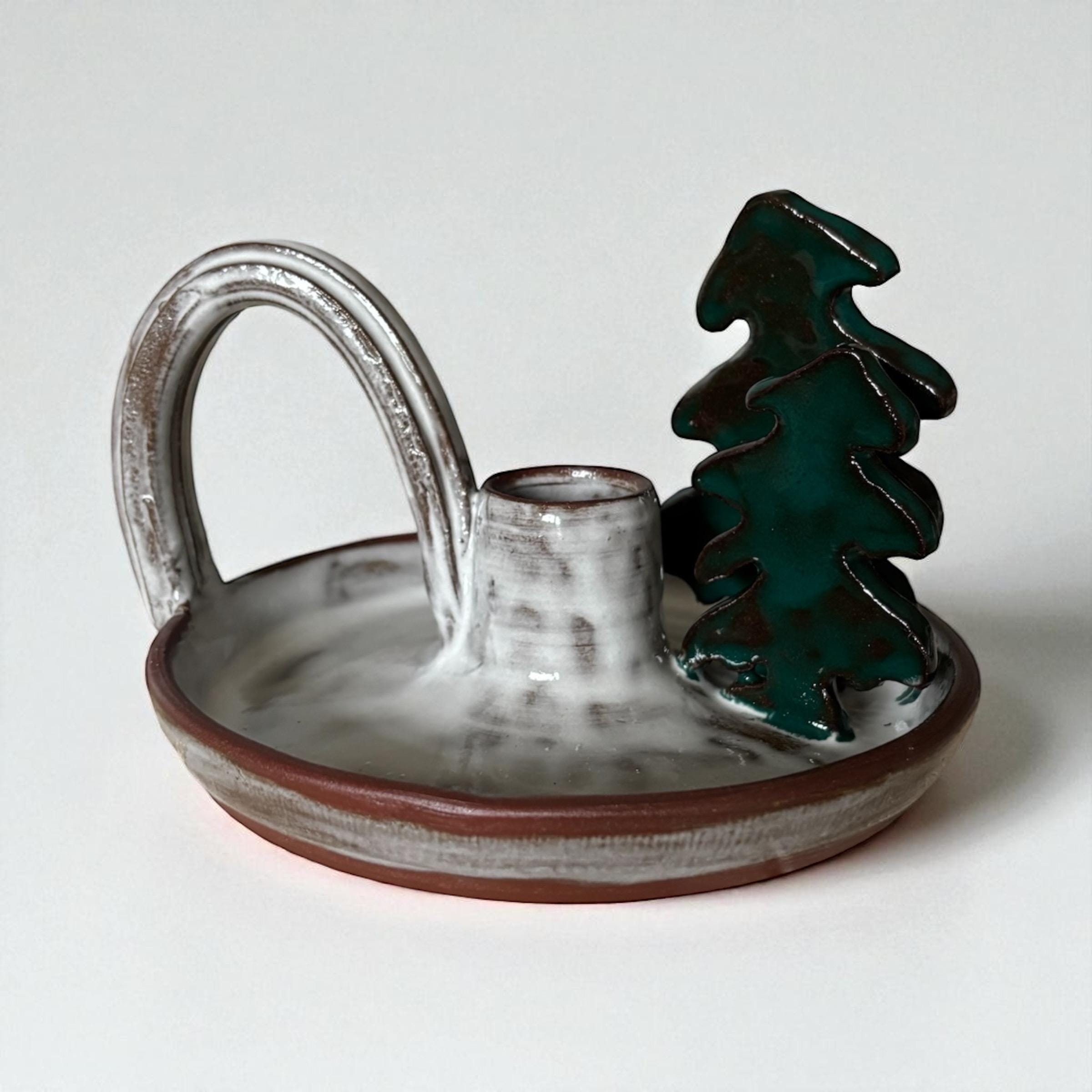 Der Teller ist weiß glasiert – ruhig, hell und fein. Die beiden Tannenbäume tragen eine tiefgrüne, glänzende Glasur, die im Licht lebendig wirkt.