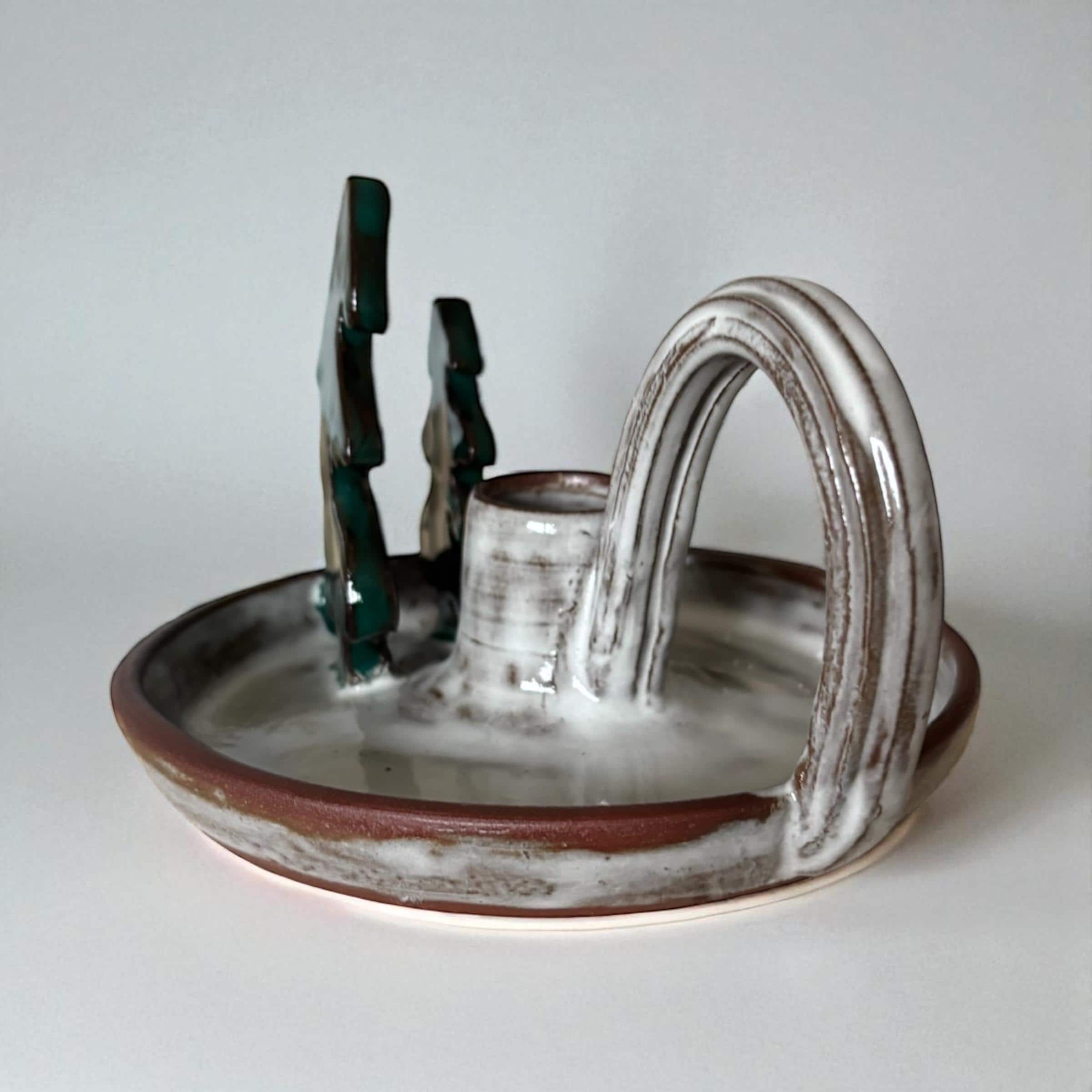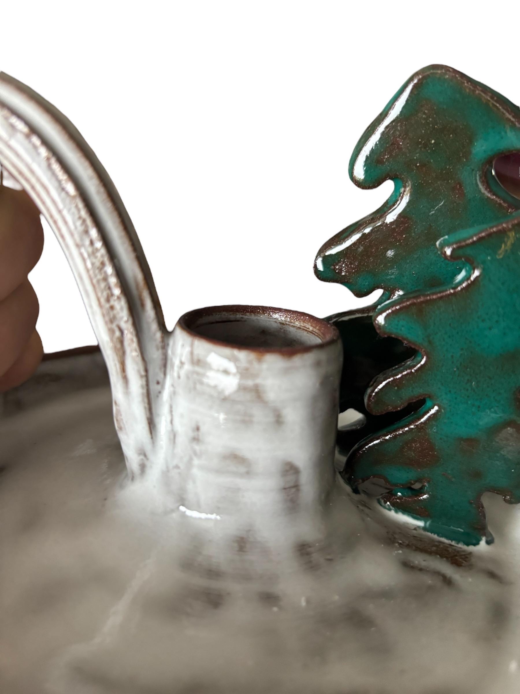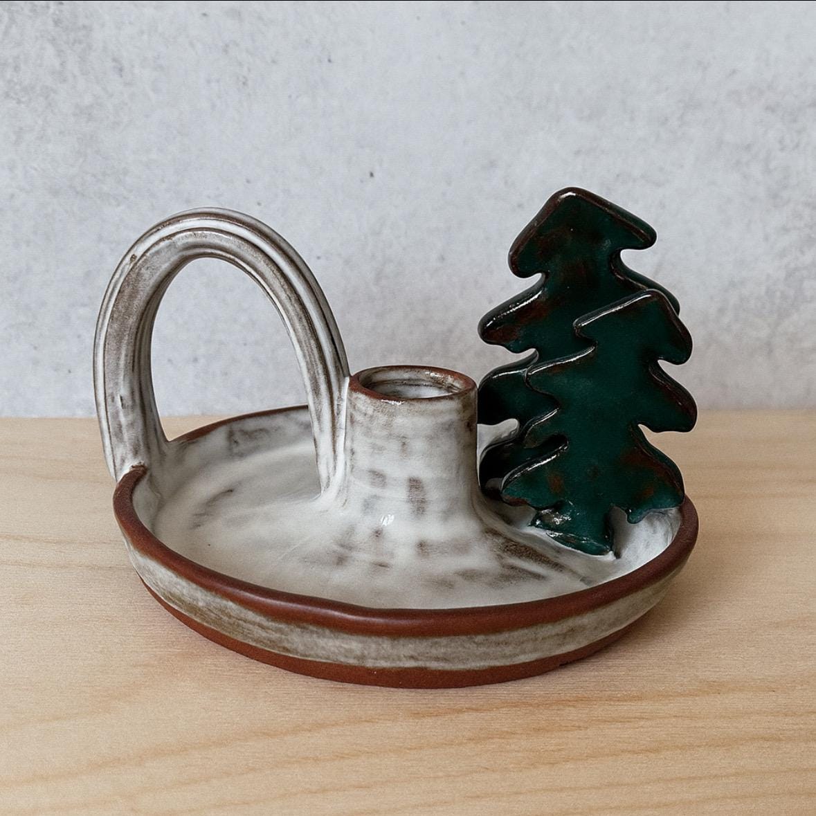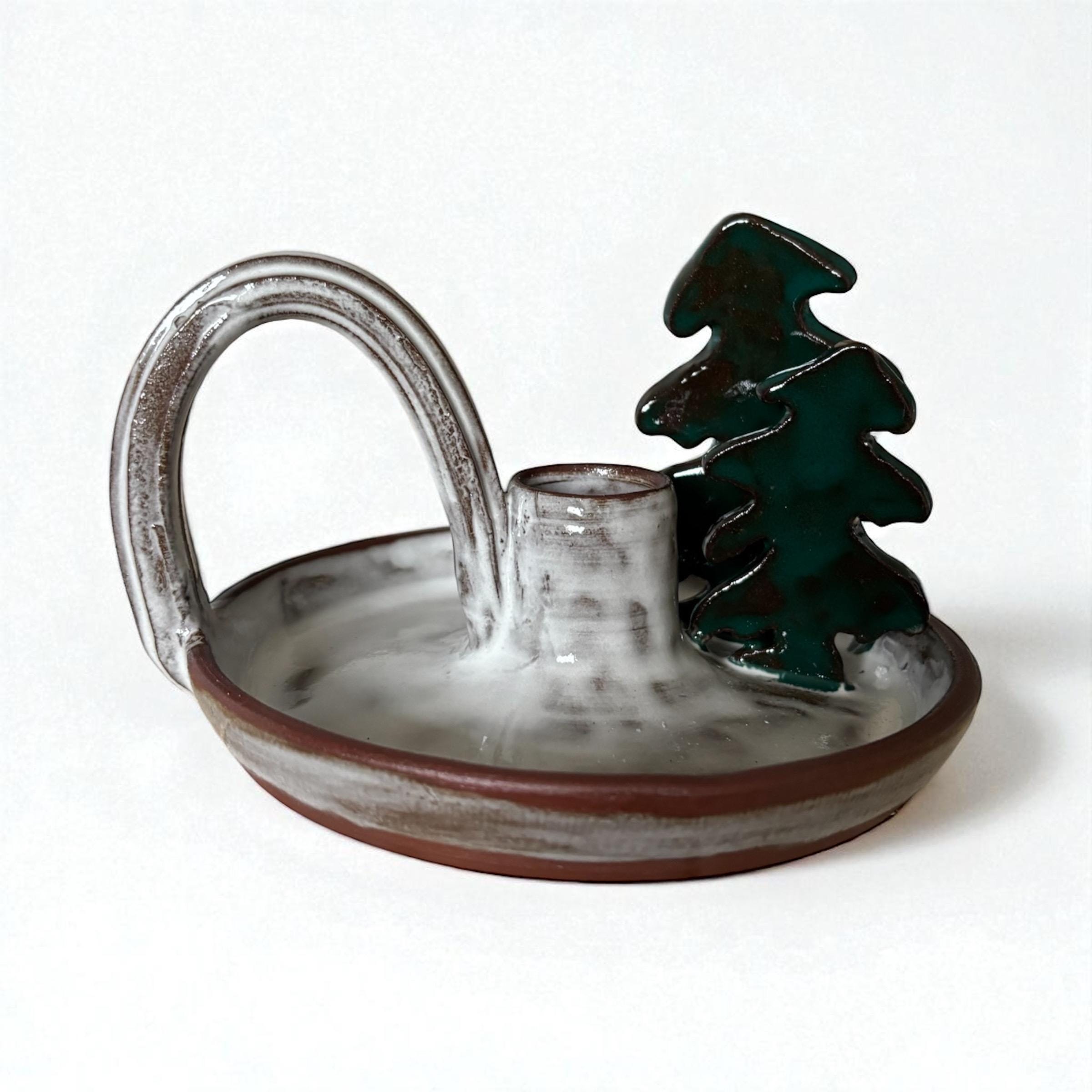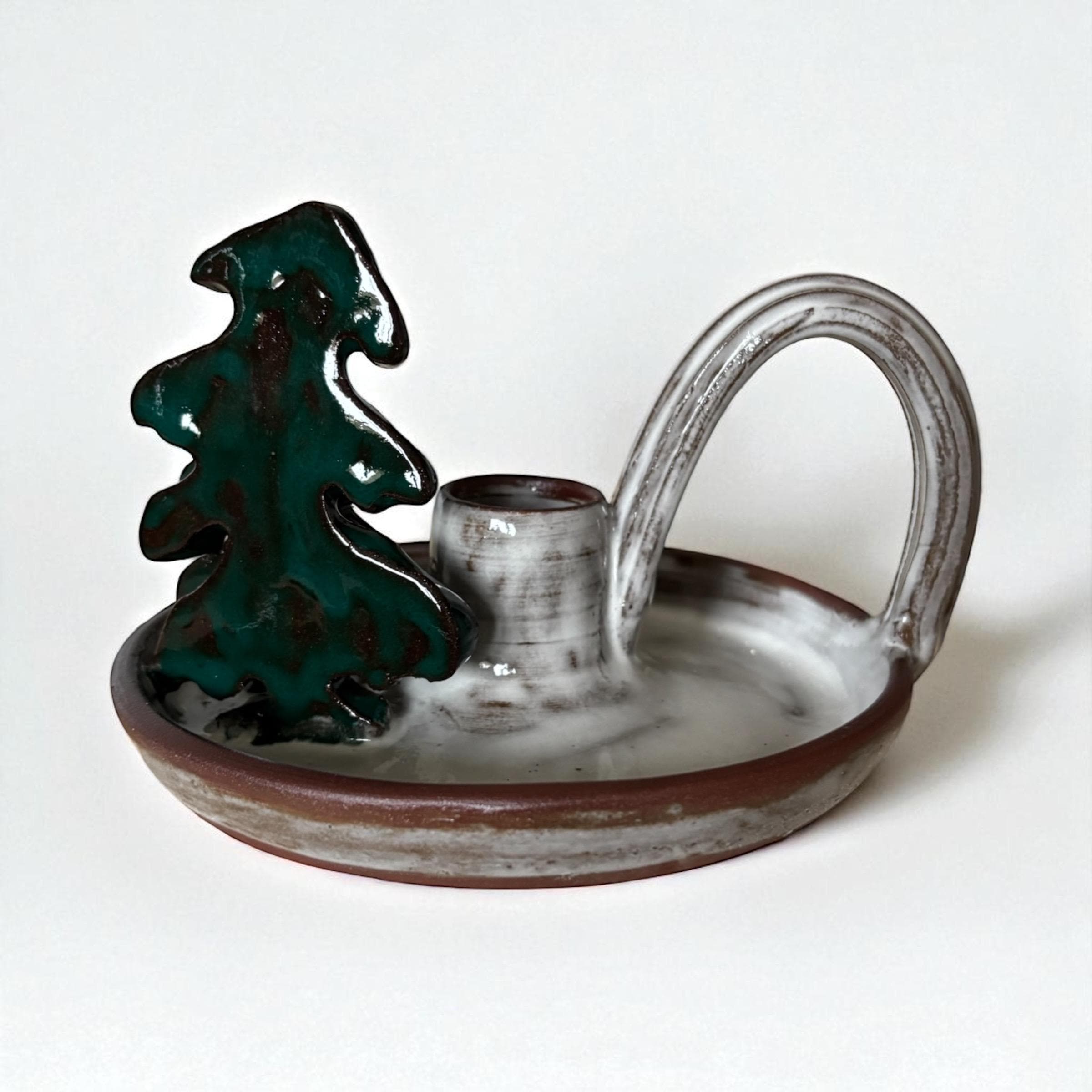 Der Teller ist weiß glasiert – ruhig, hell und fein. Die beiden Tannenbäume tragen eine tiefgrüne, glänzende Glasur, die im Licht lebendig wirkt.
