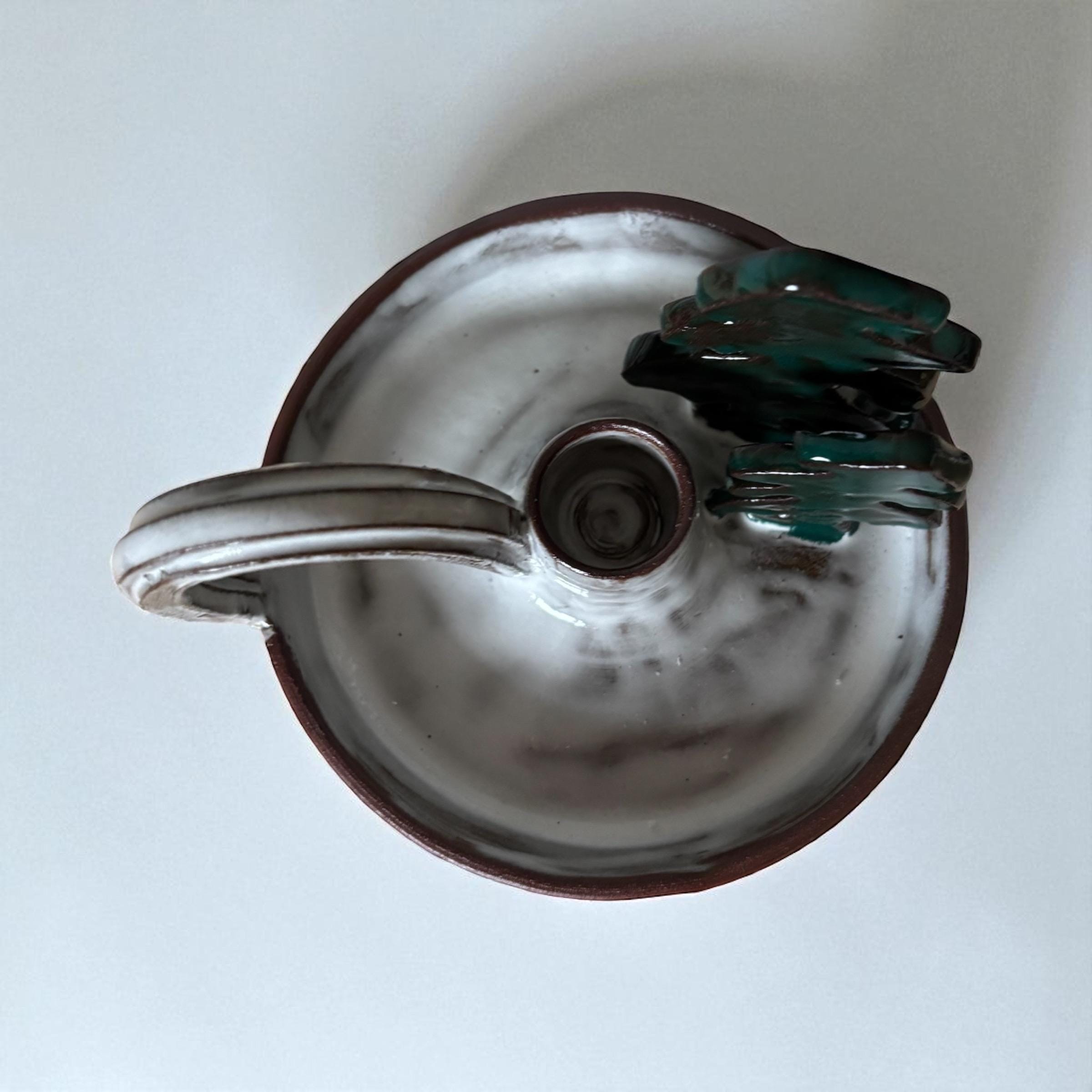 Gefertigt aus braunem Steinzeugton, dessen warmer Ton durch die Glasur sanft durchscheint.