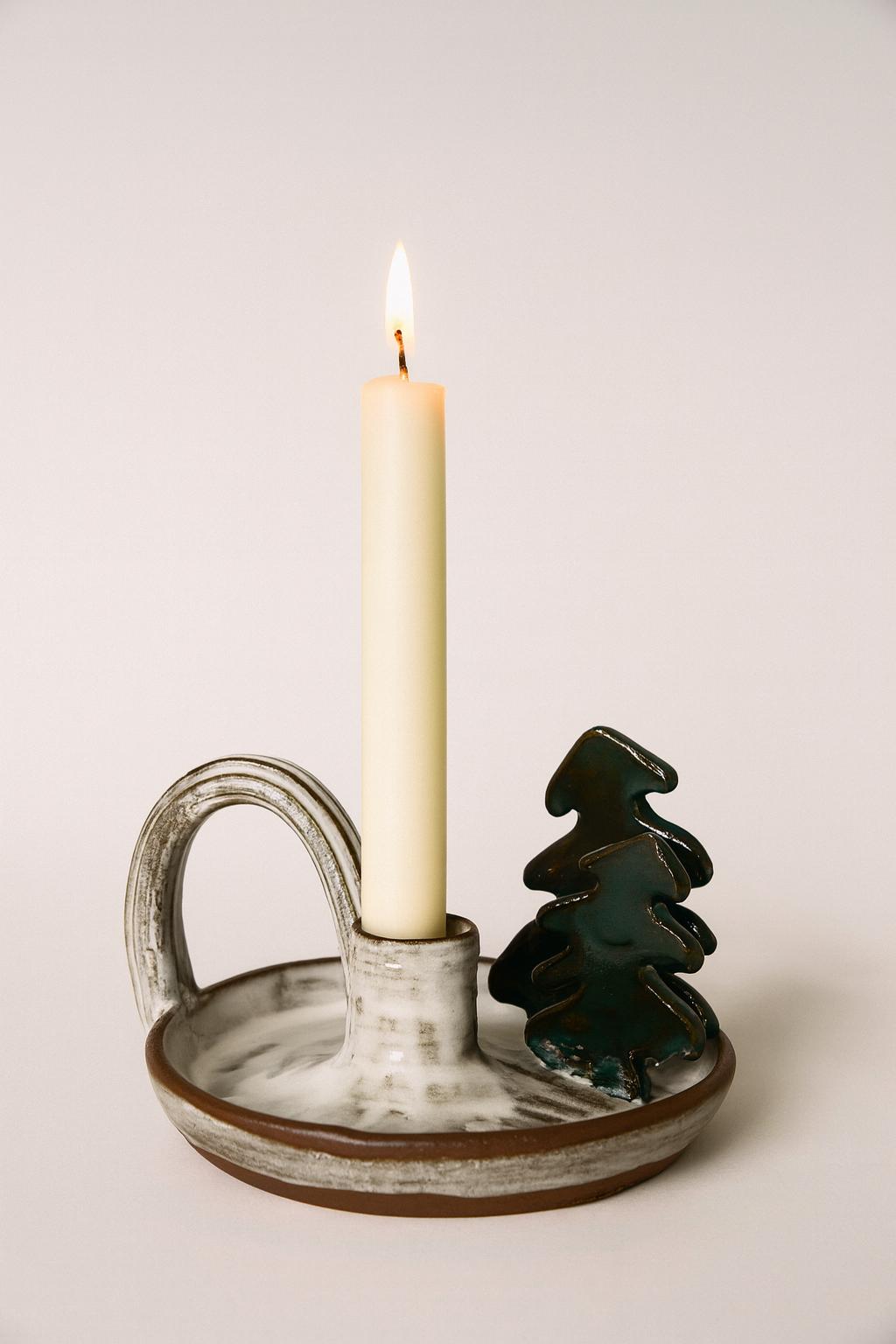 Dieser Kerzenteller mit zwei dunkelgrünen Tannenbäumen ist wie ein kleiner Moment Ruhe: warmes Licht, natürliche Farben, der Duft von Winter.