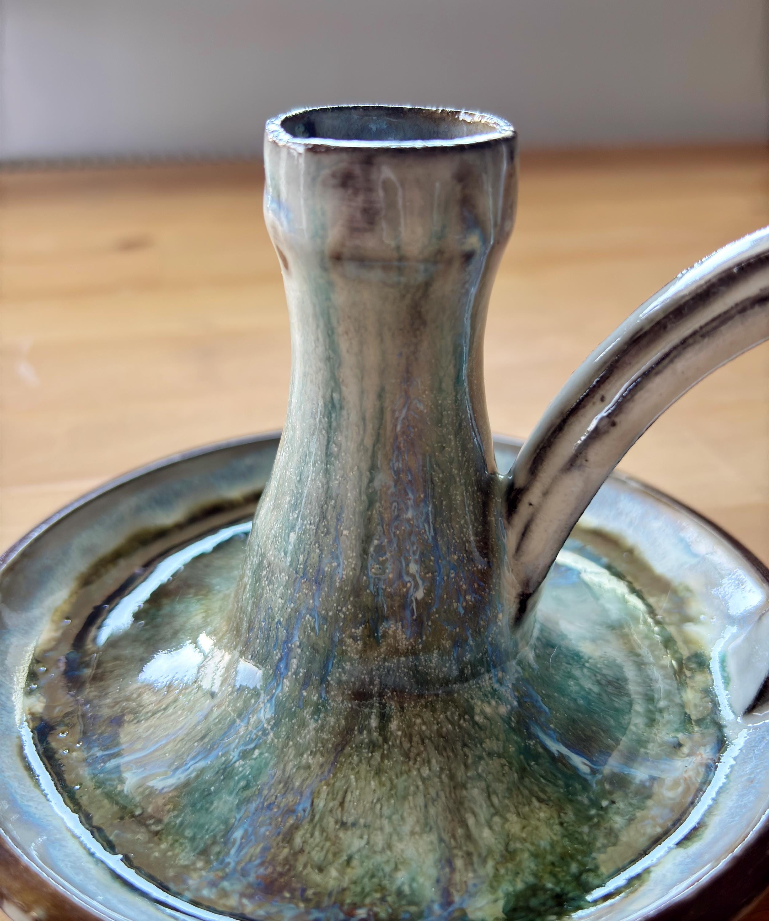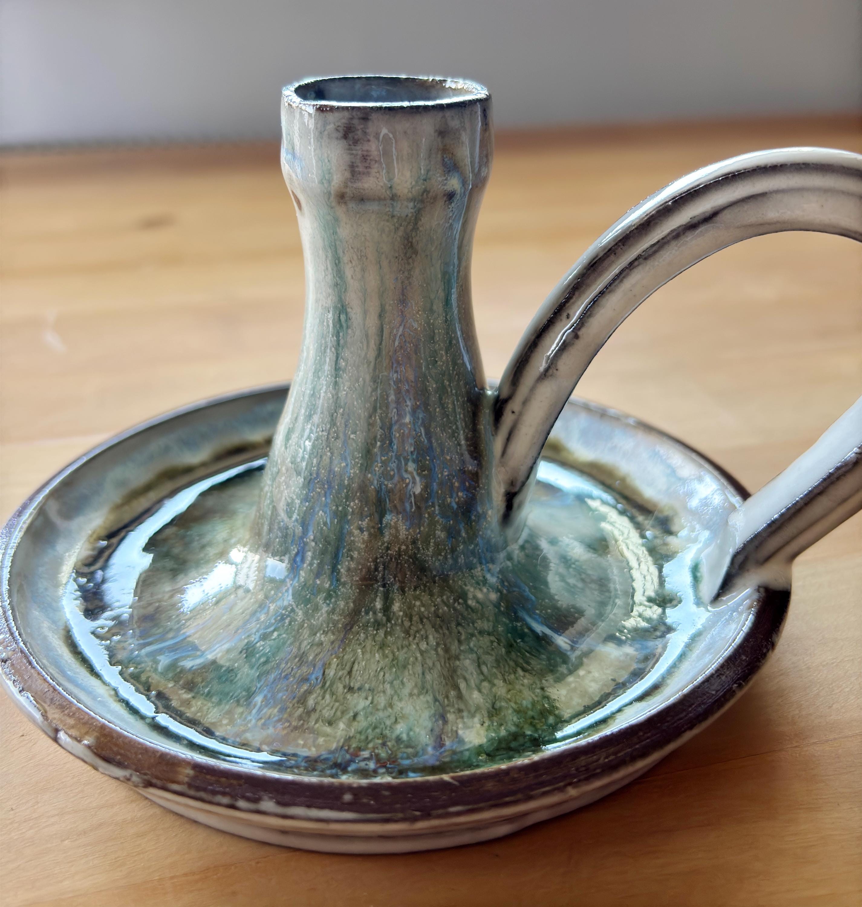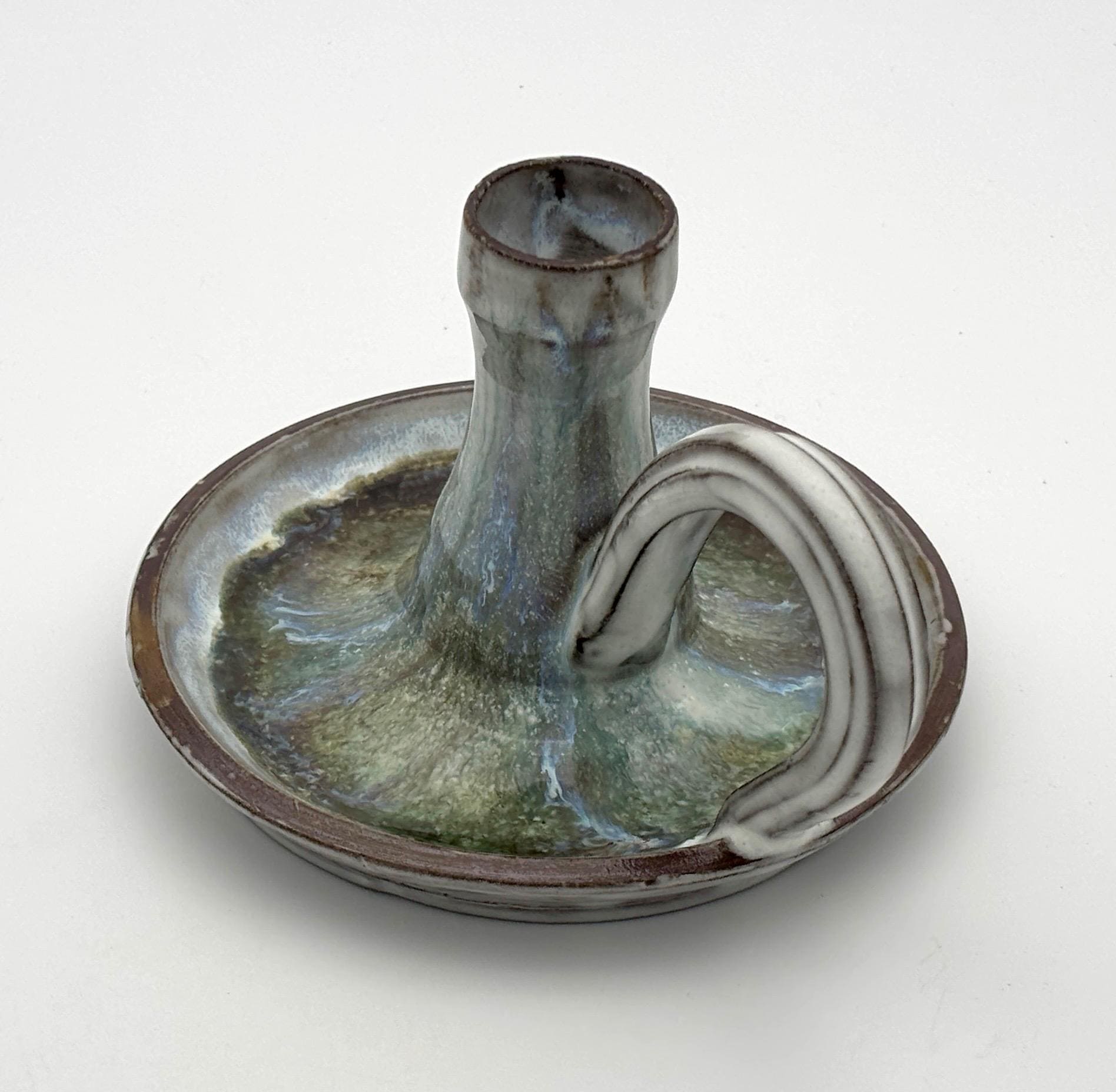 • A glaze in shades of green, grey and blue runs from the candle shaft into the plate – each firing creates unique color gradients.