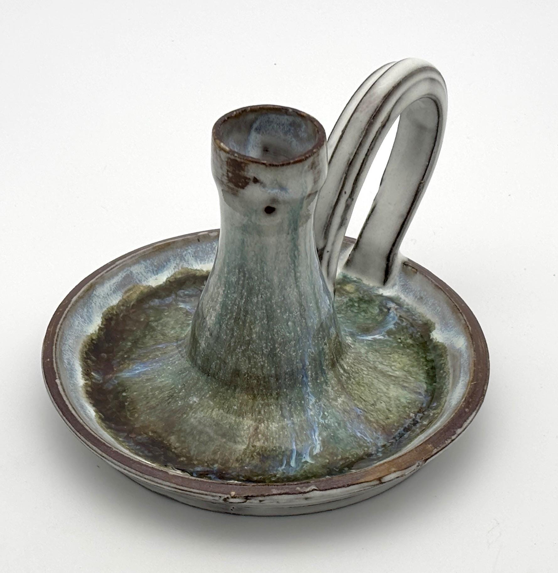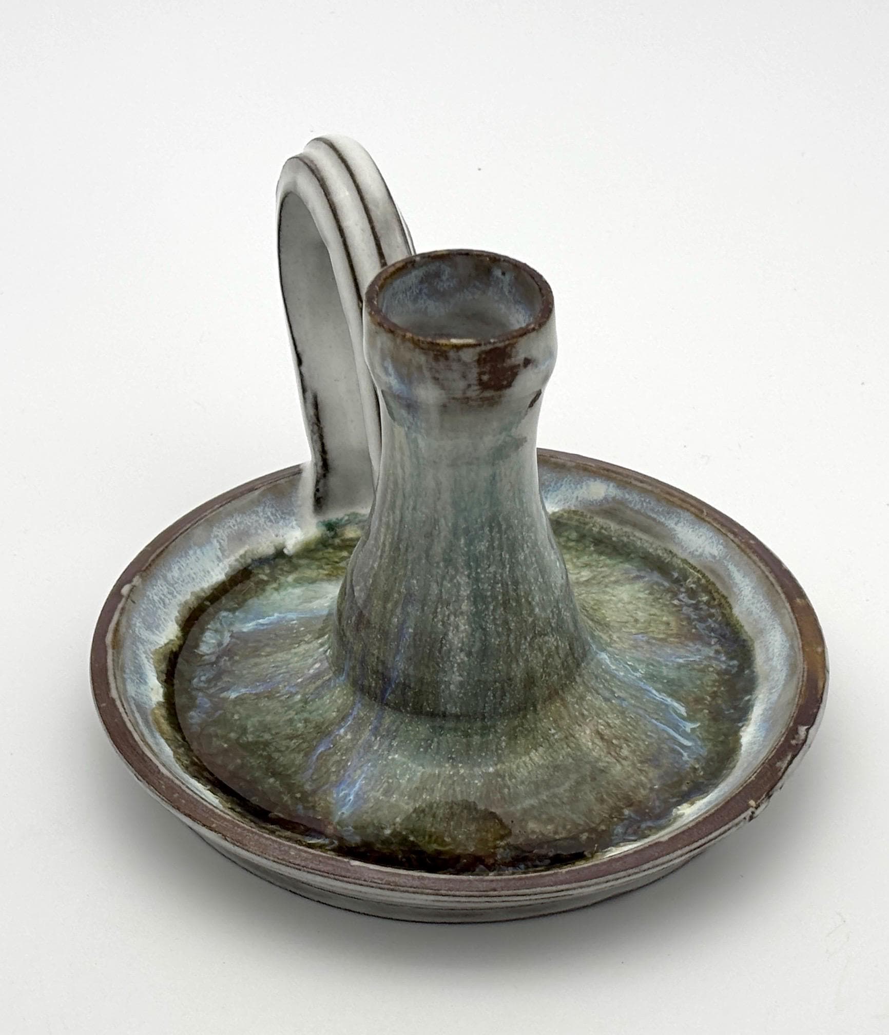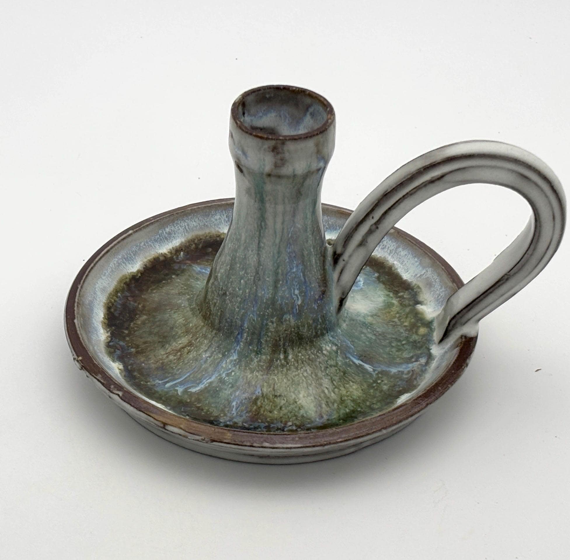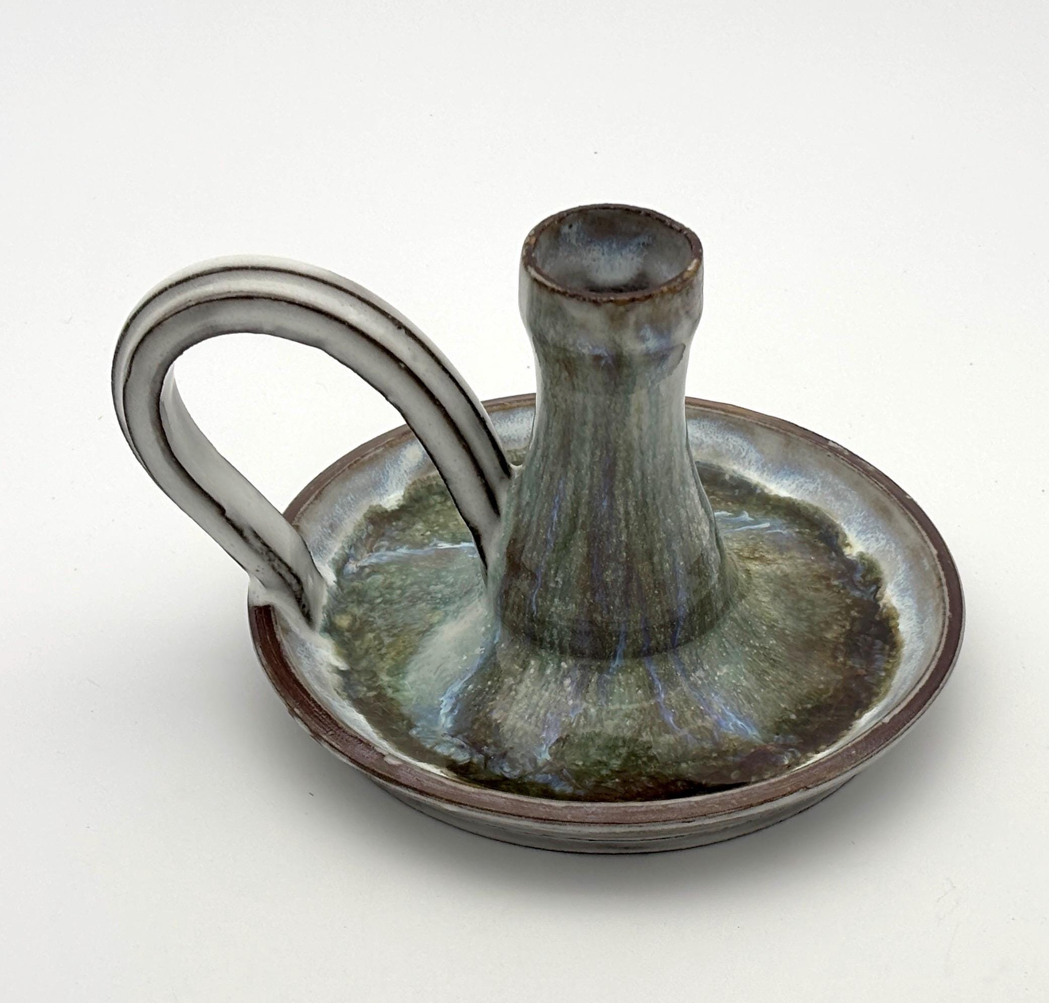 • A glaze in shades of green, grey and blue runs from the candle shaft into the plate – each firing creates unique color gradients.
