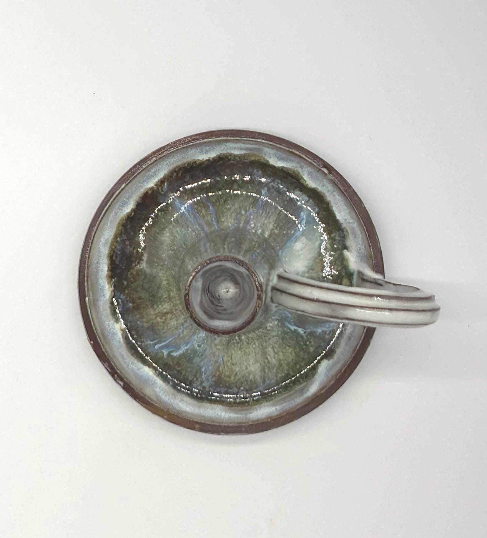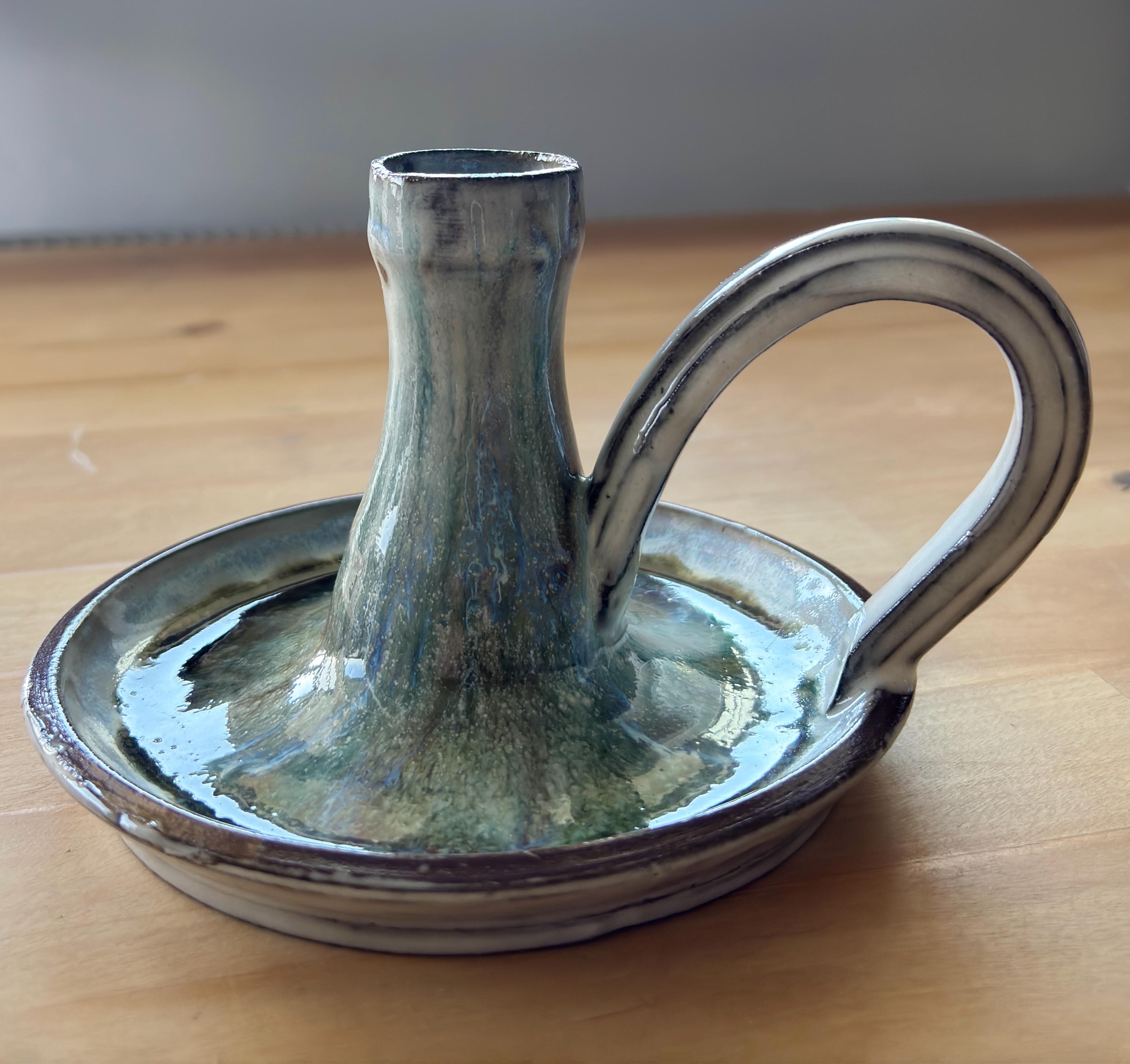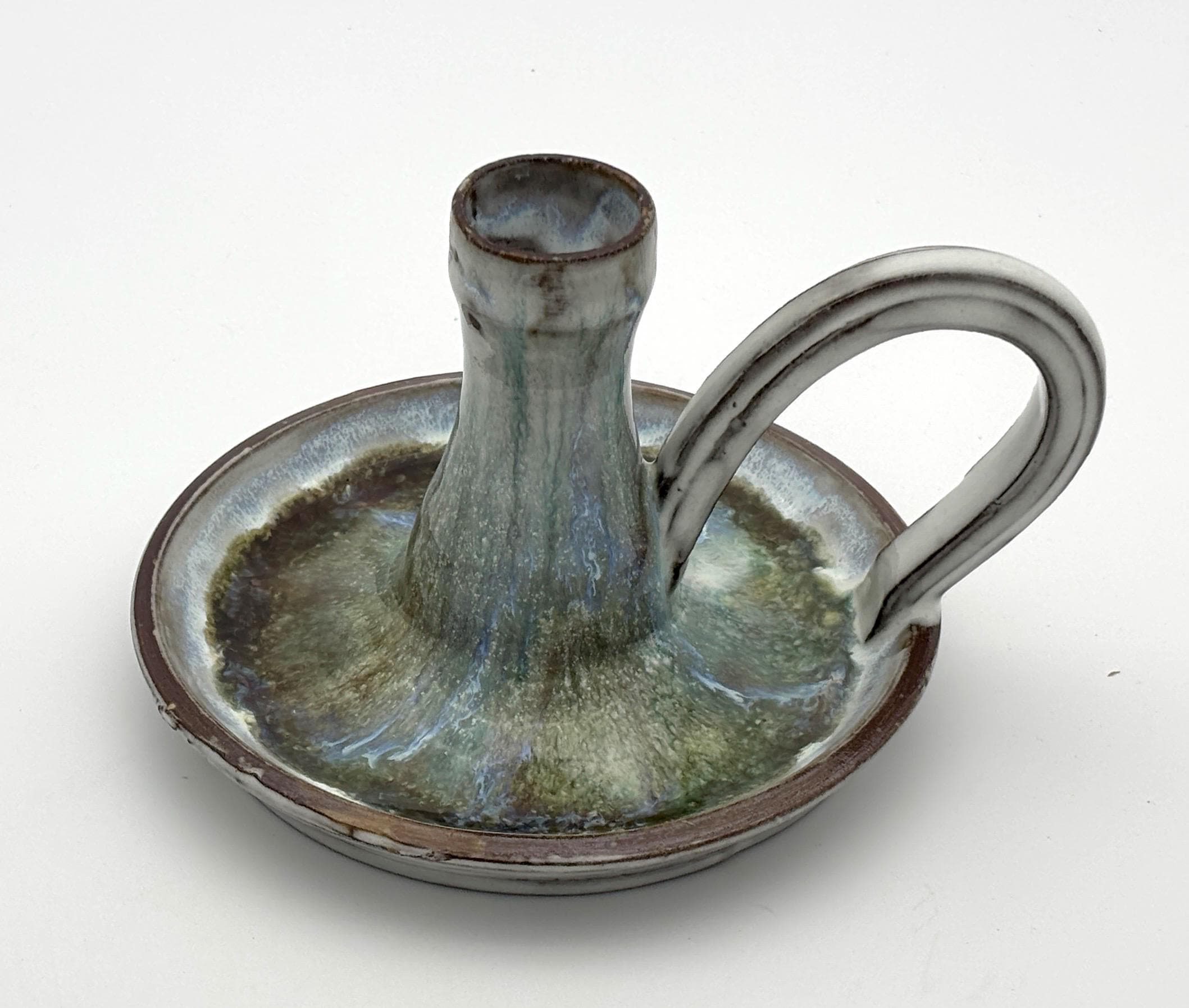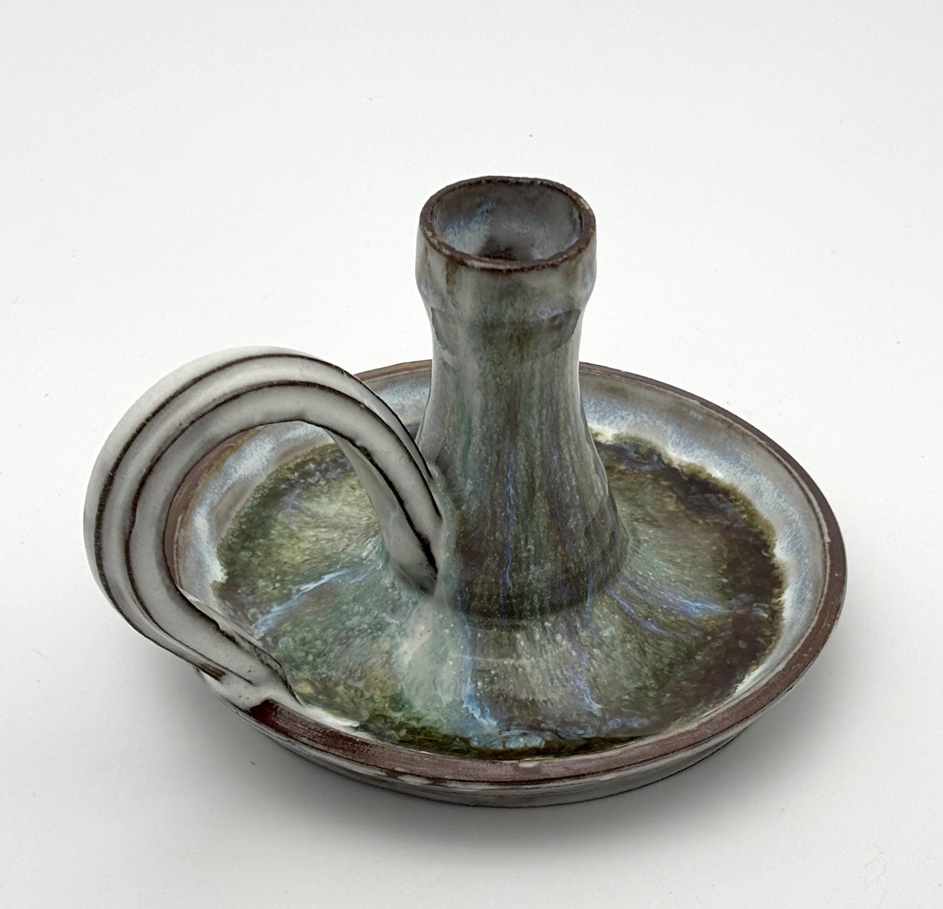 The glaze evokes morning mist over a still lake – soft gradients of green, gray, and blue that find their own movement in the fire. No two pieces are alike – each candlestick tells its own little story, visible in the flow of the glaze and palpable in the clay that shines through.