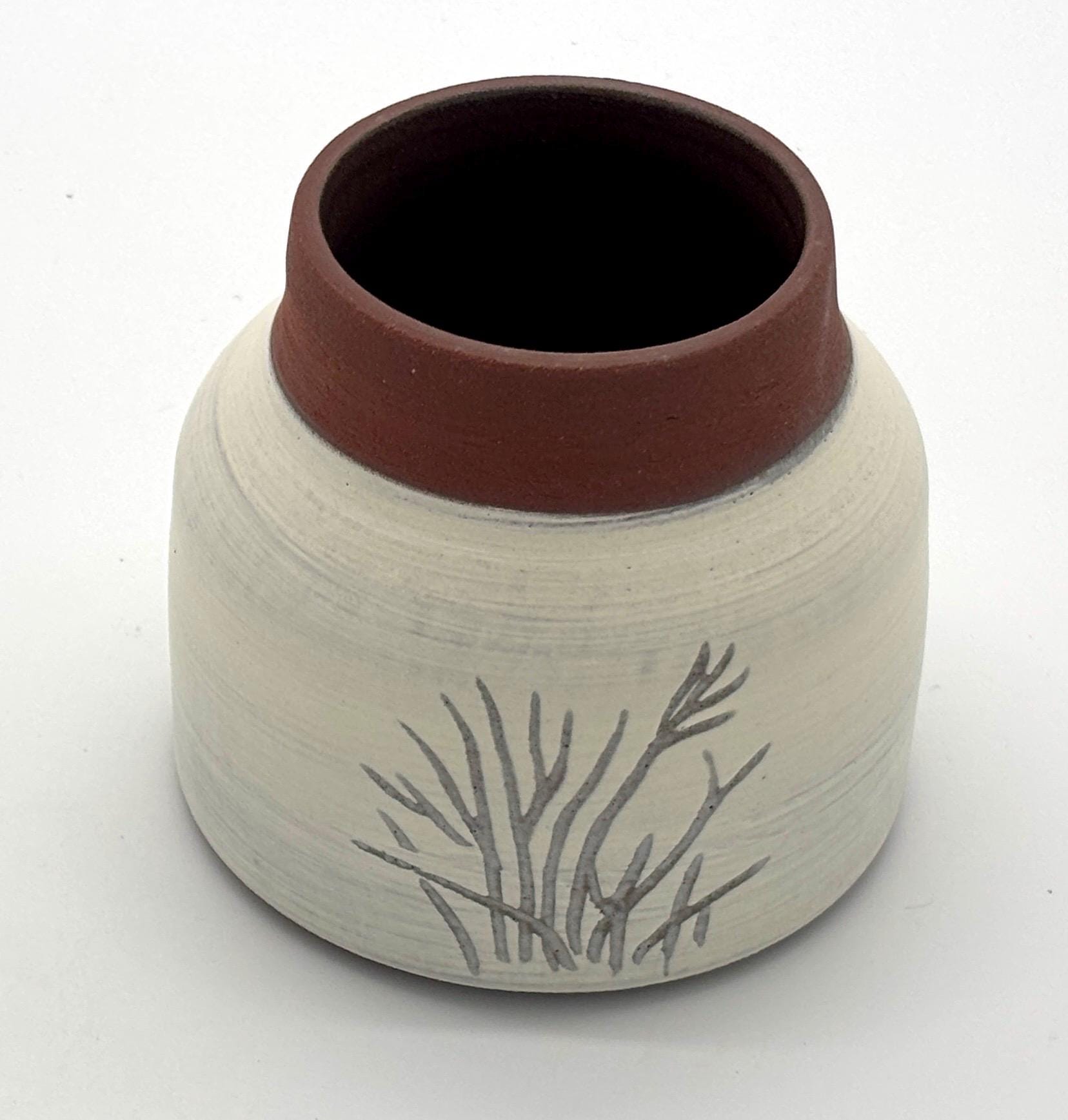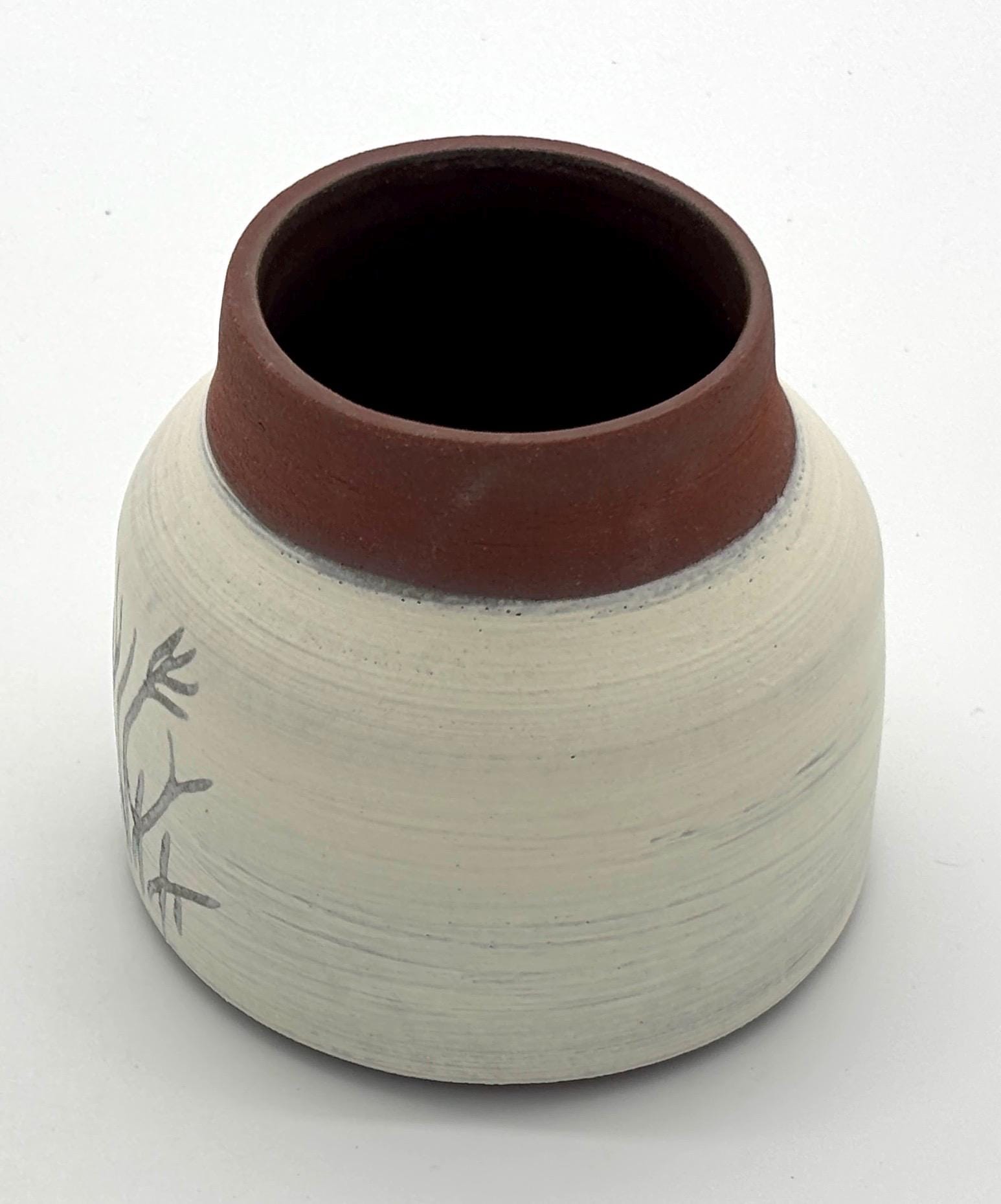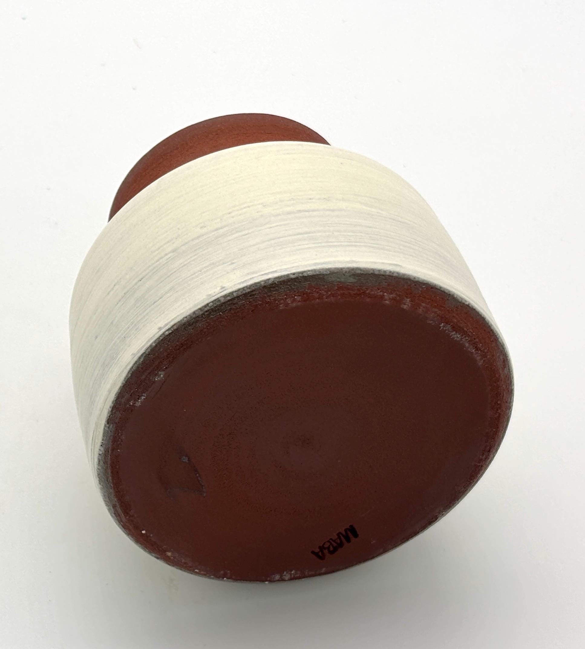 This hand-thrown ceramic vase from Studio MABA is part of a series – and yet a unique piece. Its soft, rounded shape and the calm color scheme of white and warm brown give it a light, almost natural appearance.