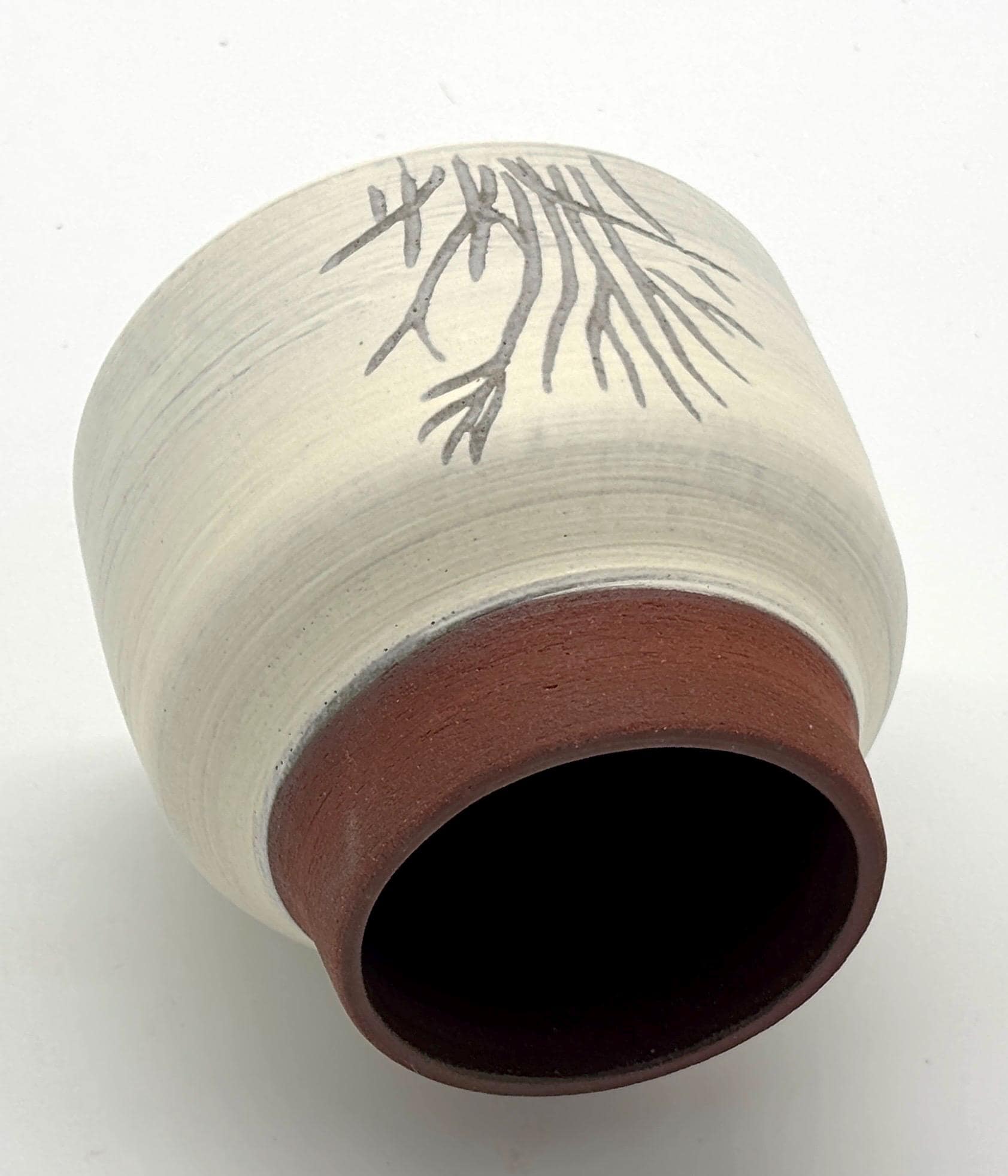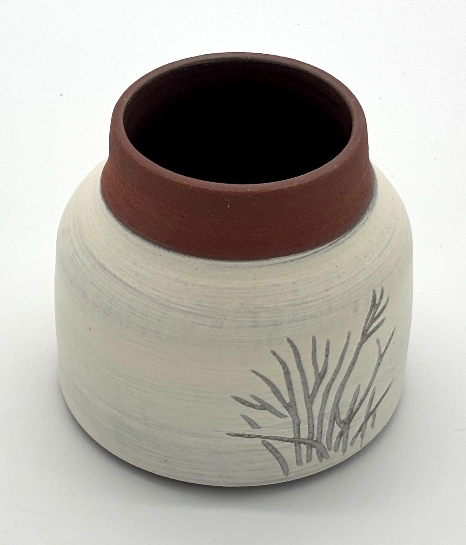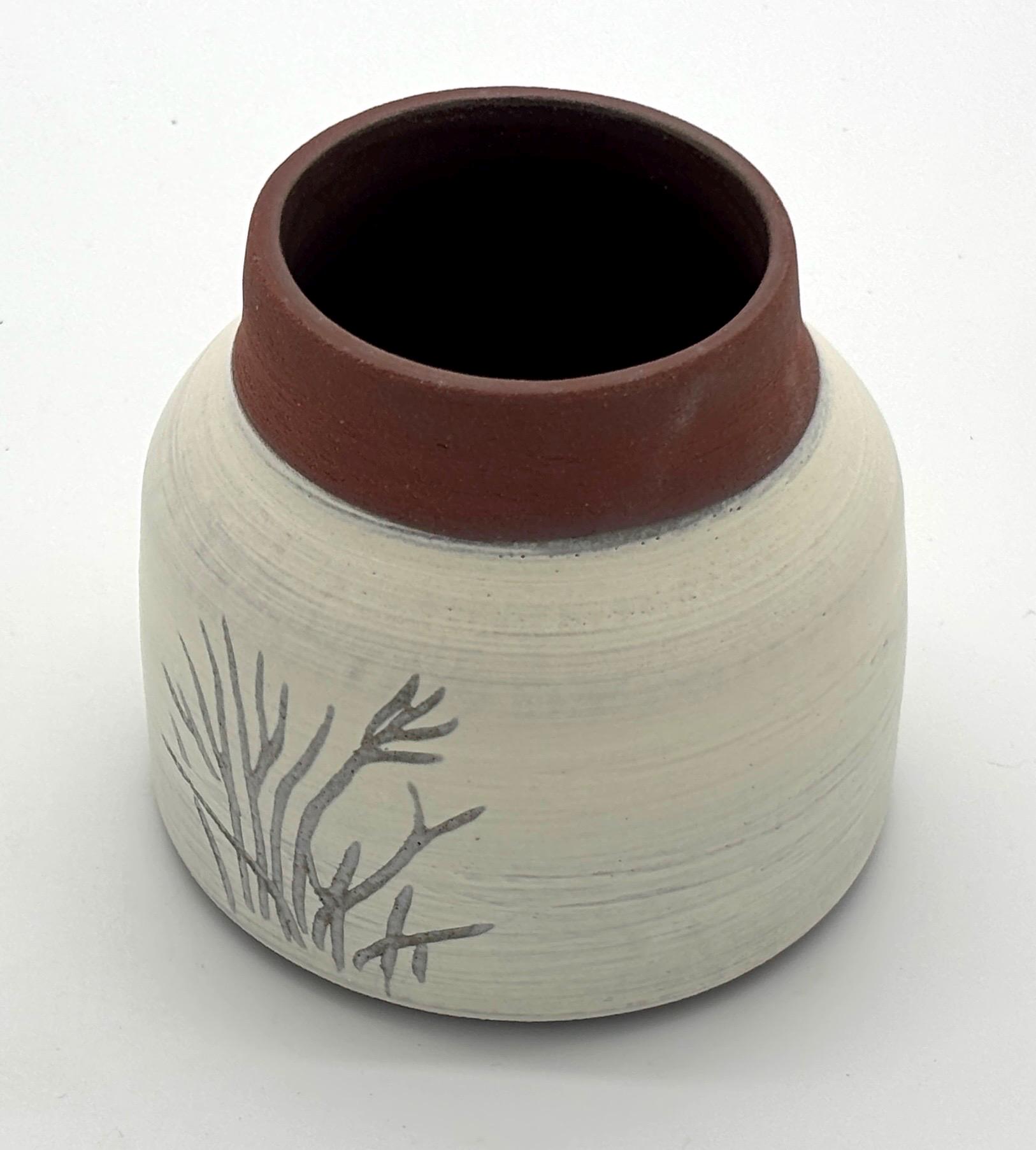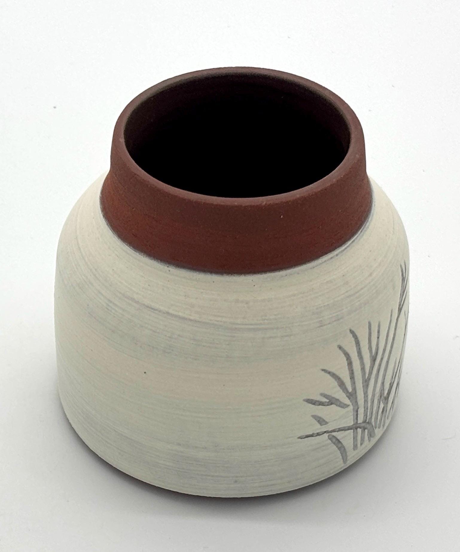This hand-thrown ceramic vase from Studio MABA is part of a series – and yet a unique piece. Its soft, rounded shape and the calm color scheme of white and warm brown give it a light, almost natural appearance.