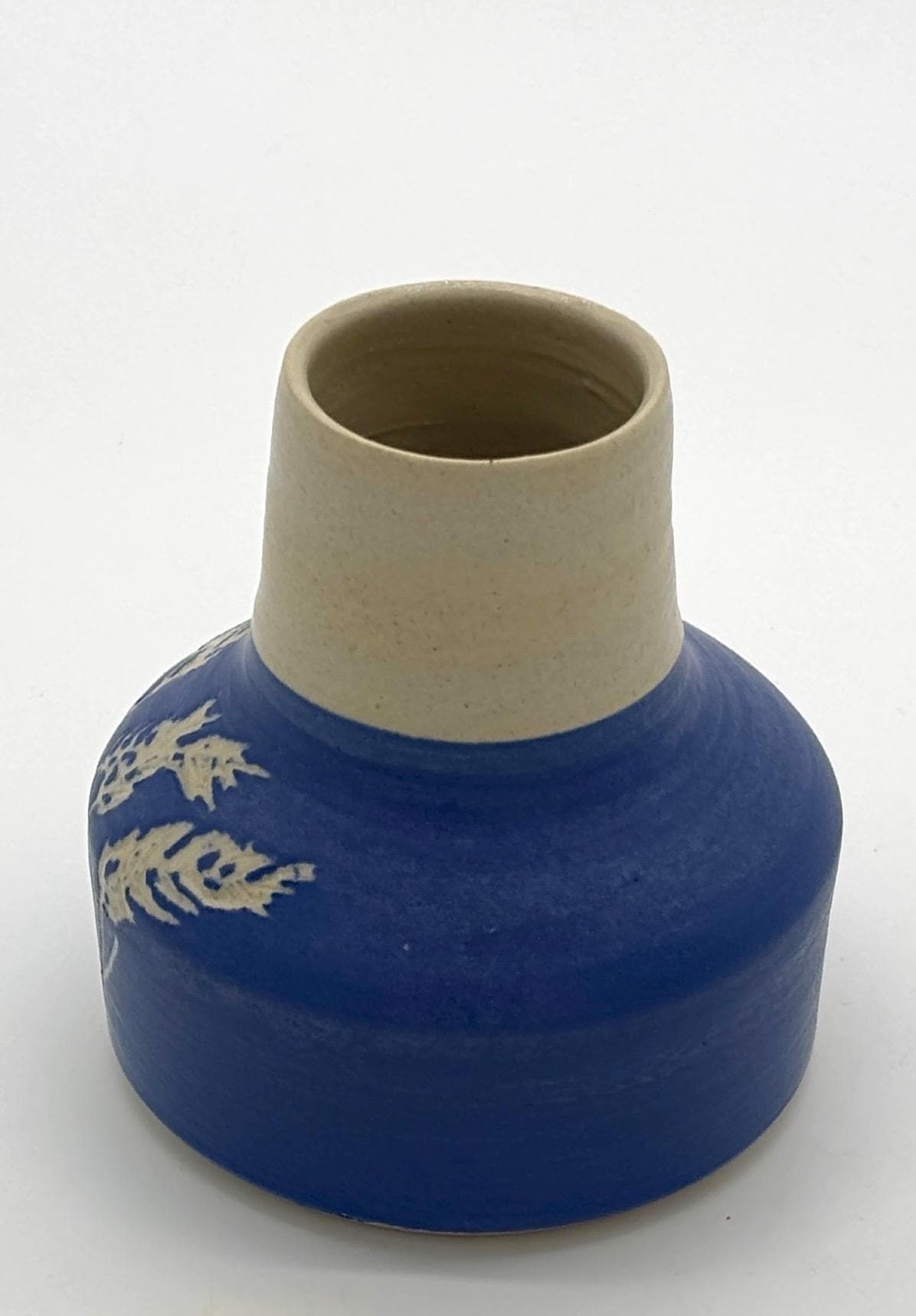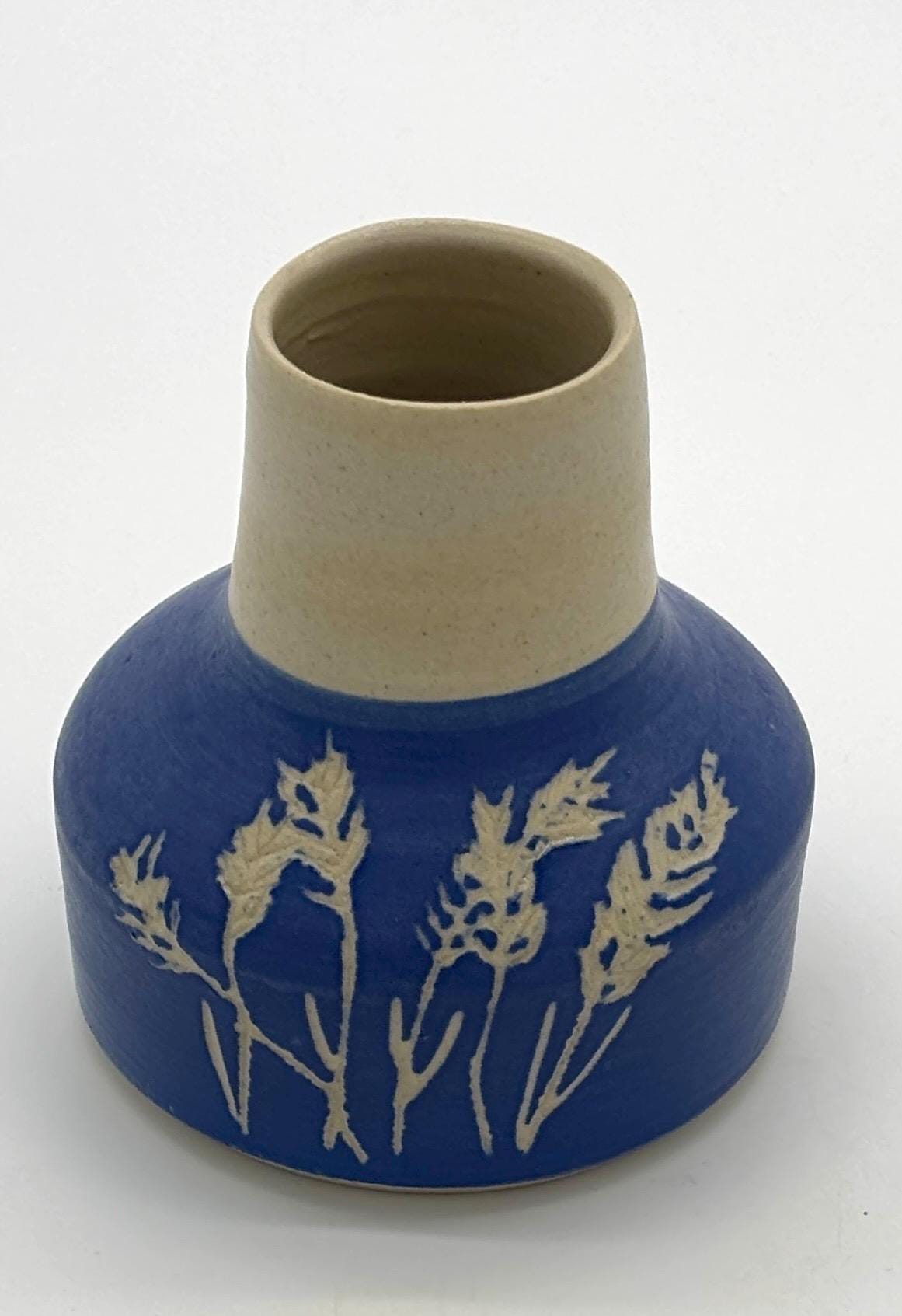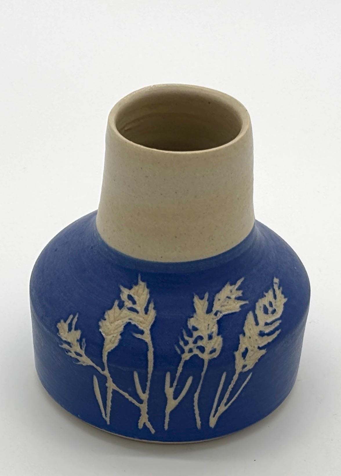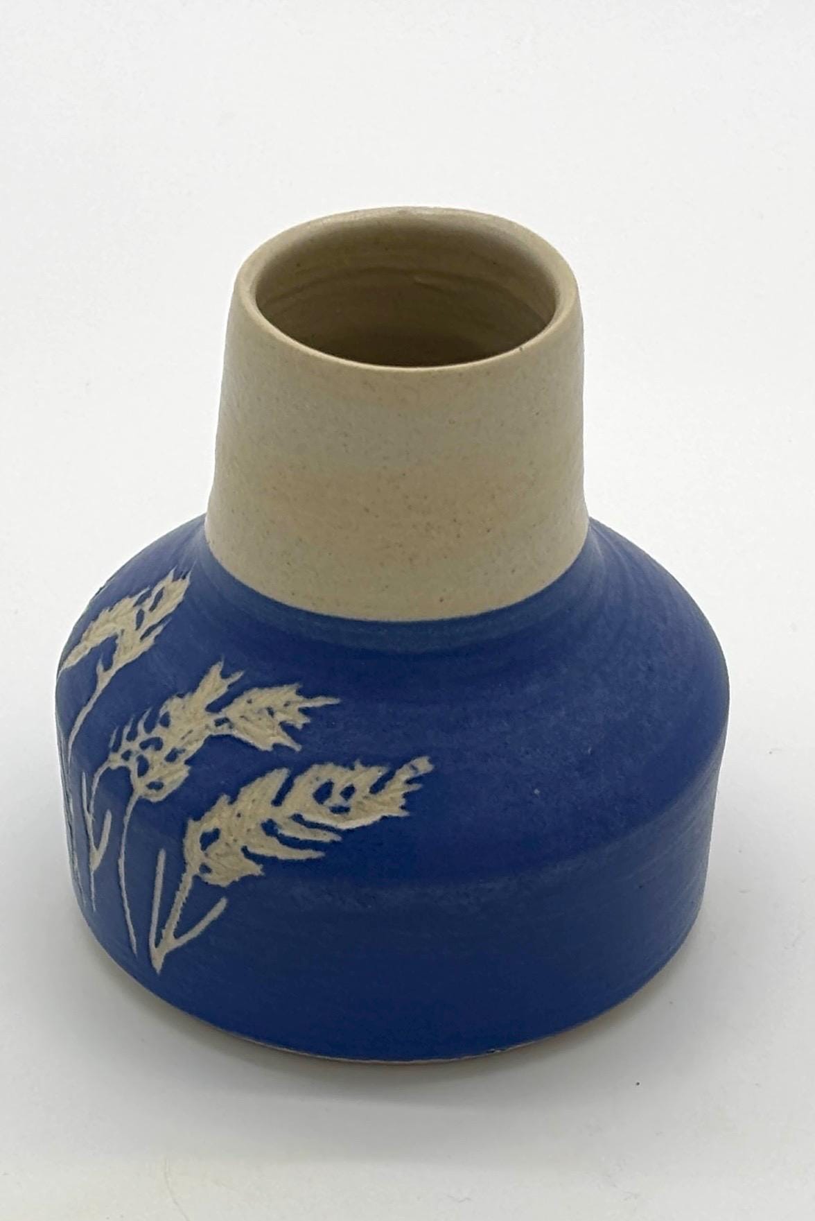 The vibrant blue at the bottom adds depth, while the natural wood upper part of the vase creates a warm, earthy balance. The engraved grass pattern gives it a lively, natural texture – like a little reminder of nature, wherever you are.